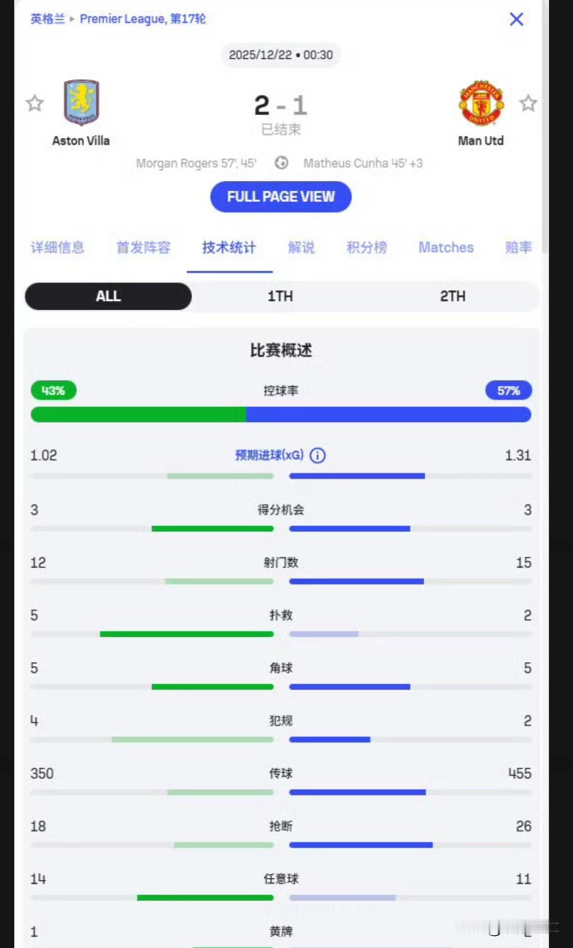 英超联赛第17轮,最终曼联客场1-2不敌维拉,曼联客场挑战阿斯顿维拉。赛后总结: - 曼联整体表现更胜一筹,从数据统计上可以体现。而摩根·罗杰斯的进球决定了比赛走向。输球实在有些运气不佳。 - 阿莫林的战术布置得当,临场调整也很合理。这个结果不能归咎于他的指挥。 - 看到杰克·弗莱彻和谢伊·莱西完成首秀,真是太棒了! - 艾登·海文上半场表现亮眼,在一个并不完全适合他的位置上(更希望他踢左中卫)依然发挥出色。 - 多尔古渐入佳境:为库尼亚送出的那记绝妙传中本该扳成2-2,球队1-1的进球也源自他的抢断。 - 莱尼约罗正经历信心低谷,看到他被恶意攻击令人痛心。请支持年轻球员! - 塞斯科已经回归,却不明白为何不增加传中找他这个点。这样太浪费机会了。