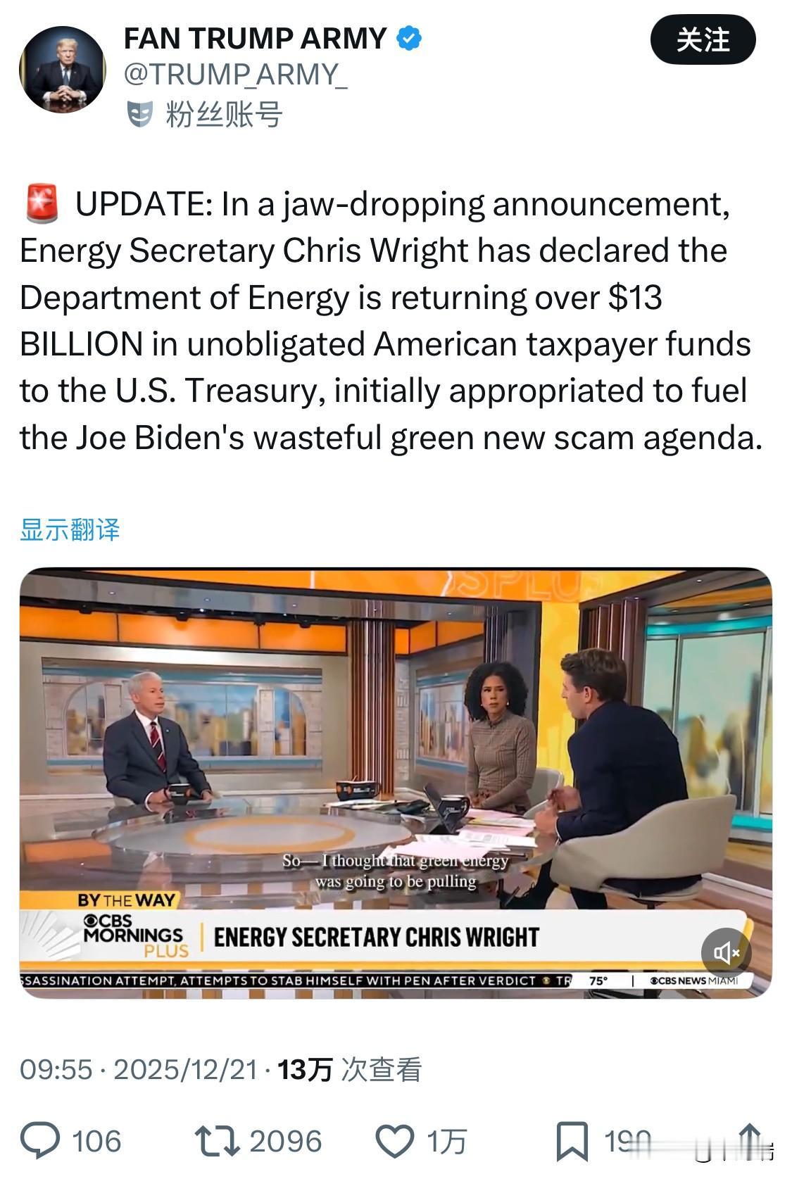 最新消息:美国能源部长克里斯·赖特宣布,能源部将向美国财政部返还超过 130 亿美元的未使用的美国纳税人资金,这些资金最初被拨款用于资助乔·拜登浪费的绿色新骗局议程。