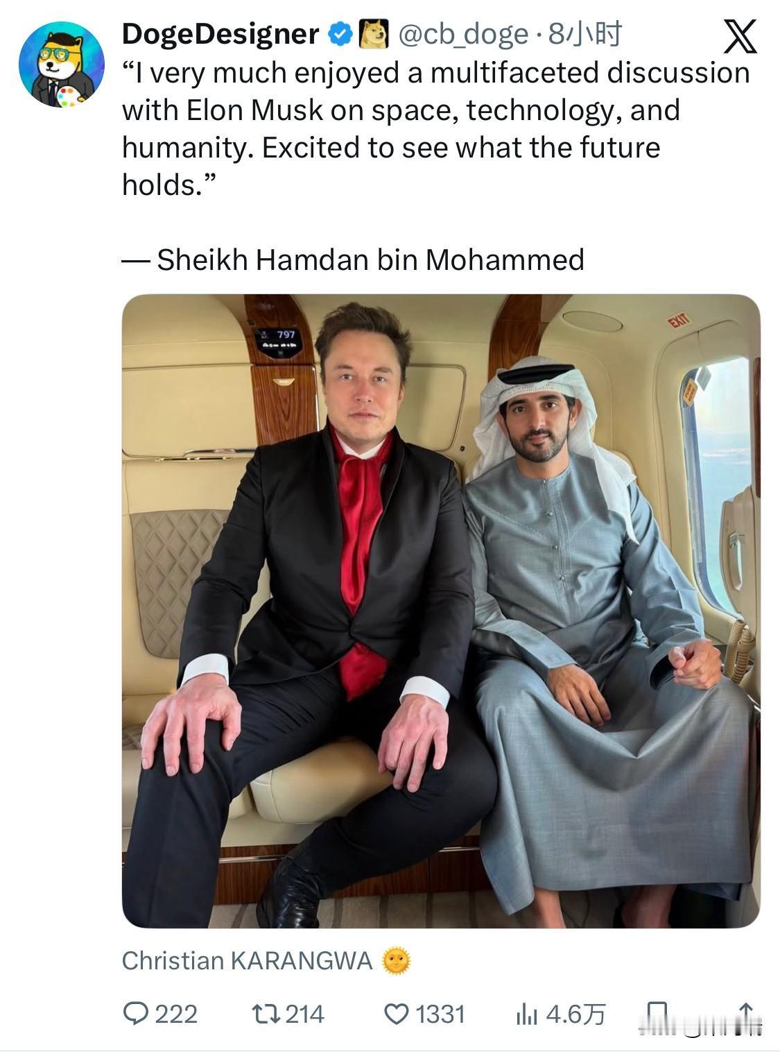 埃隆·马斯克 (Elon Musk) 与迪拜王储兼阿联酋副总理兼国防部长谢赫·哈姆丹·本·穆罕默德·本·拉希德·阿勒马克图姆 (Sheikh Hamdan bin Mohammed bin Rashid Al Maktoum) 会面并进行了讨论。 双方讨论强调了阿联酋和迪拜在人工智能、先进技术和太空探索方面的远见卓识和取得的重大进展,以及全球合作和知识交流的重要性。 谢赫·哈姆丹·本·穆罕默德说:“我非常享受与埃隆·马斯克就太空、科技和人性等多个方面进行的讨论。很期待未来会如何发展。” 这次会面发生在2025 年 12 月 21 日(星期日)。迪拜王储谢赫·哈姆丹在社交媒体上分享了照片和此次讨论。