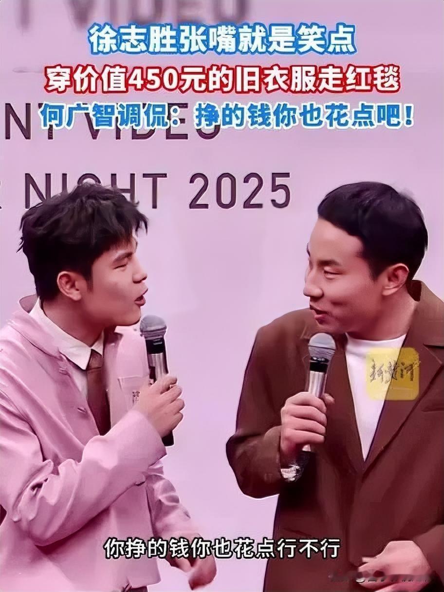 徐志胜450元旧衣走红毯,真实感圈粉无数 2025年12月21日星光大赏红毯上,徐志胜以一身450元的旧衣亮相,瞬间成为焦点。当其他明星身着高定礼服时,他这件简约单品尽显松弛感。镜头前他幽默自然,与其他人精致装扮形成鲜明对比。好友何广智调侃他“挣的钱也花点吧”,引发网友热议。徐志胜用真实打破了红毯的严肃,证明质朴可爱比昂贵礼服更动人。徐志胜 脱口秀 徐志胜 徐志胜走红毯