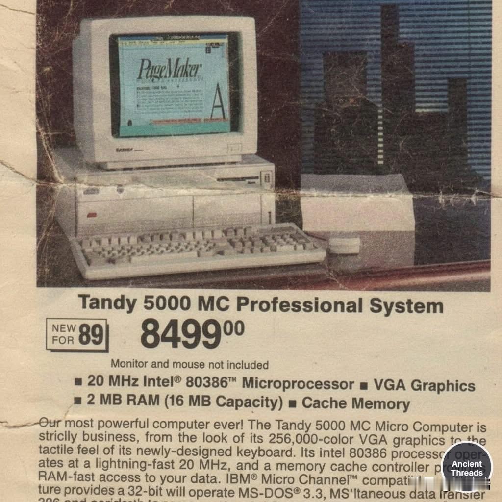 Tandy 5000 MC Professional System是 坦迪公司(Tandy Corporation )于 1988 年发布的台式计算机,广告中的 8,499 美元价格是其在 1989 年左右的零售价(不含显示器和鼠标)。 主要特点与背景 处理器和内存:该系统配备了 20 MHz 的英特尔 80386 微处理器、2 MB RAM(可扩展至 16 MB)和缓存内存。在当时,2MB 的 RAM 已经是一个相当大的容量。 架构:它是首批非 IBM 生产的使用 IBM Micro Channel(微通道架构,MCA)总线的 PS/2 克隆机型之一。MCA 提供了 32 位的数据路径,旨在实现比当时普遍的 ISA 总线更高的数据传输速率。 操作系统:它支持 MS-DOS 3.3、MS OS/2 和多用户 SCO XENIX 386 等操作系统。 市场与价格:该系统主要通过 Tandy 的 Radio Shack 零售店销售。虽然技术评论良好,但由于价格昂贵(基础型号售价 4,999 美元起,广告中的价格更高,在 2024 年约合 22,596 美元)且市场上有更多便宜的替代品,销量并不好。 广告细节:广告显示器上运行的是 Adobe PageMaker 软件。广告中的价格标签 "NEW FOR 89" 表示是 1989 年的价格。