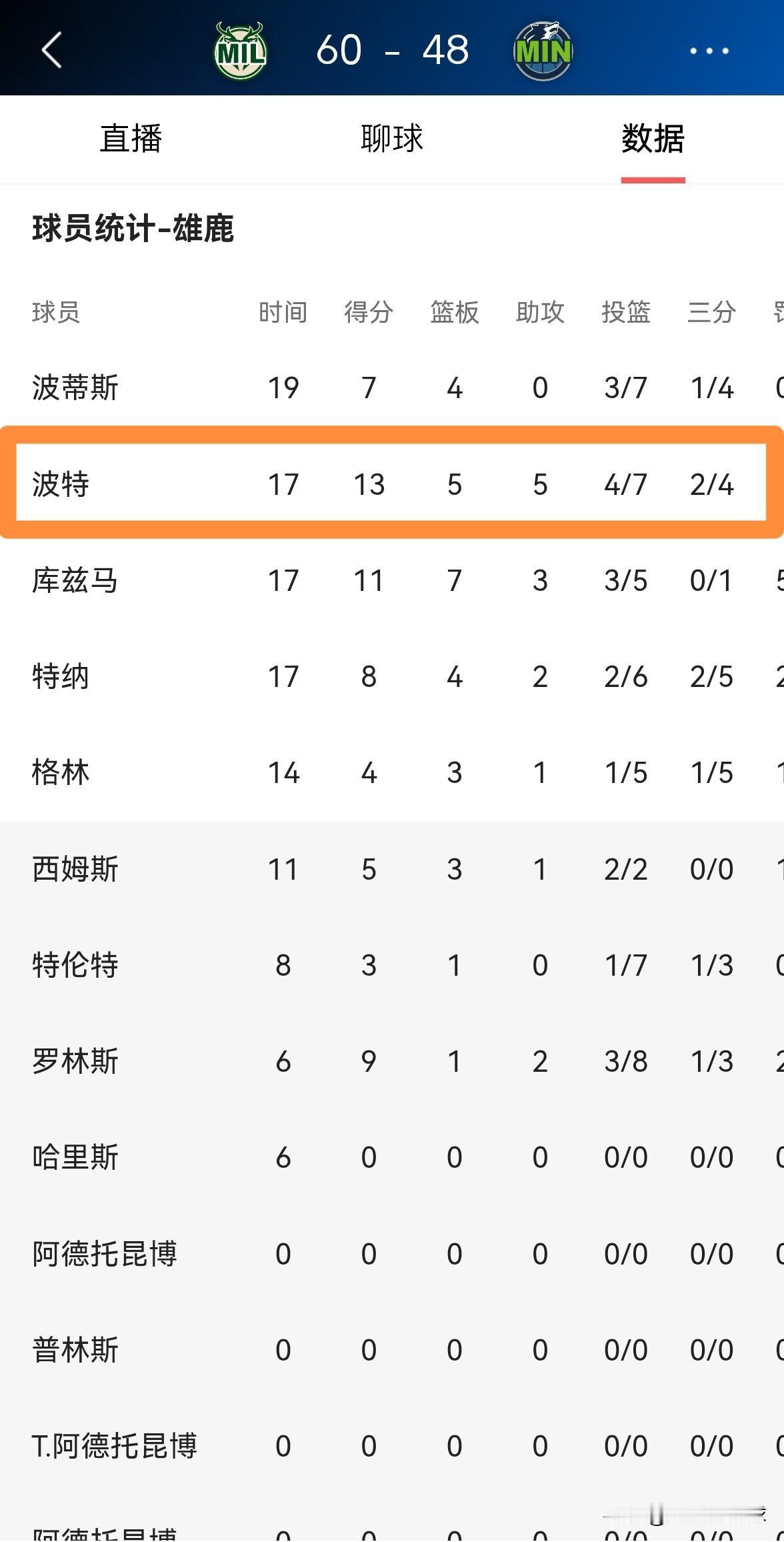 雄鹿当家控卫小凯文-波特真是太惊艳了!在今天雄鹿客场挑战森林狼的比赛中,目前双方半场战罢,雄鹿以60:48领先对手。在前两节比赛中,小波特首发出战17分钟,投篮7中4,其中三分球4中2、罚球4中3得到13分5篮板5助攻1抢断,他的场上正负值为+6。 以目前的情况来看,小波特本场比赛很有可能会斩获三双,在字母哥因伤缺阵的情况下,小波特的表现真是足够惊艳。