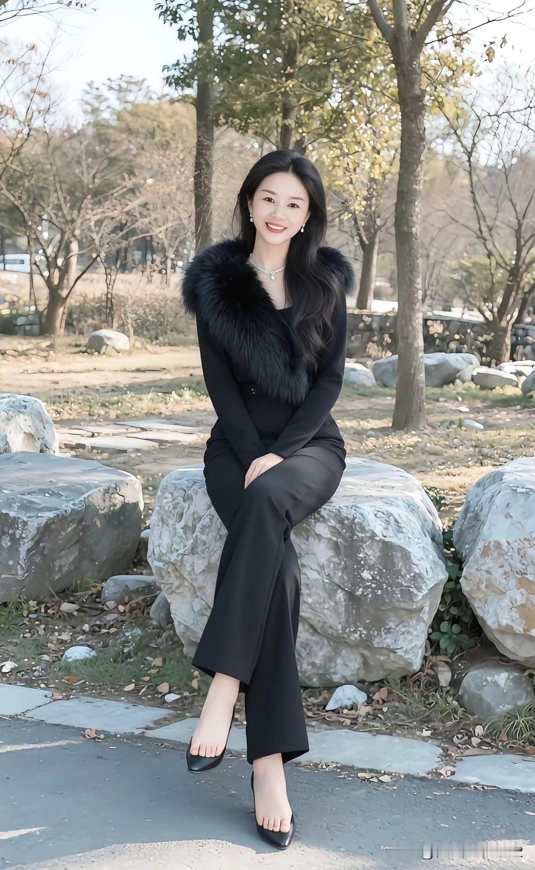 黑衣美人倚石坐 秋意满怀心自闲