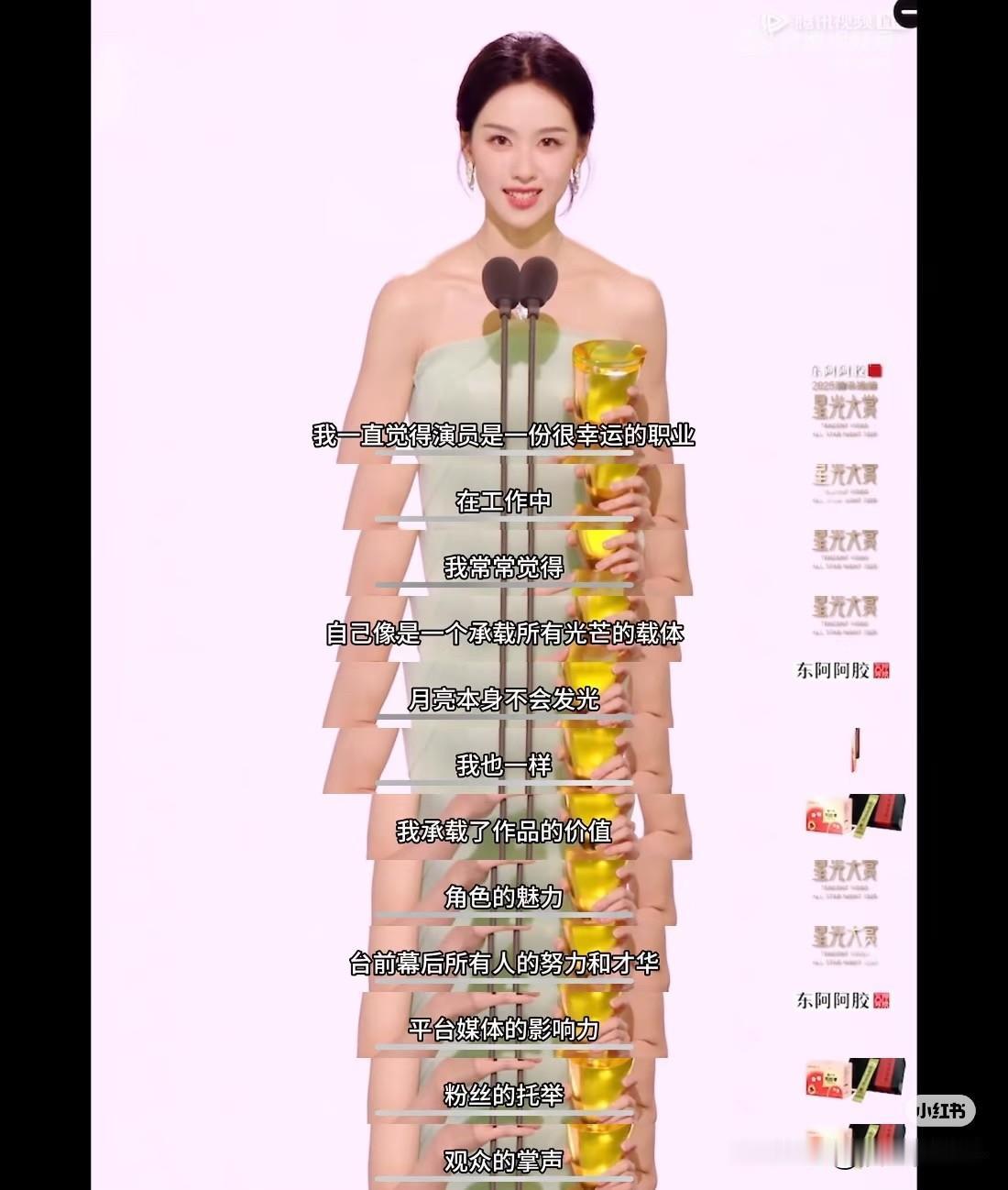 女孩子真的要多读书 不信你看陈都灵 她的这段领奖让她在一众明星里脱颖而出。 陈都灵说:我一直觉得演员是一份很幸运的职业,在工作中我常常觉得自己像是一个承载所有光芒的载体。月亮本身不会发光,我也一样,我承载了作品的价值,角色的魅力,台前幕后所有人的努力和才华。平台媒体的影响力,粉丝的托举,观众的掌声,是你们的光折射到我身上,让我今天才能在此刻闪耀。 哇塞,这才是文化工作者应该有的文化水平。 她的这段话把星光大赏这个活动都变得高级了。 不愧是学霸出身。