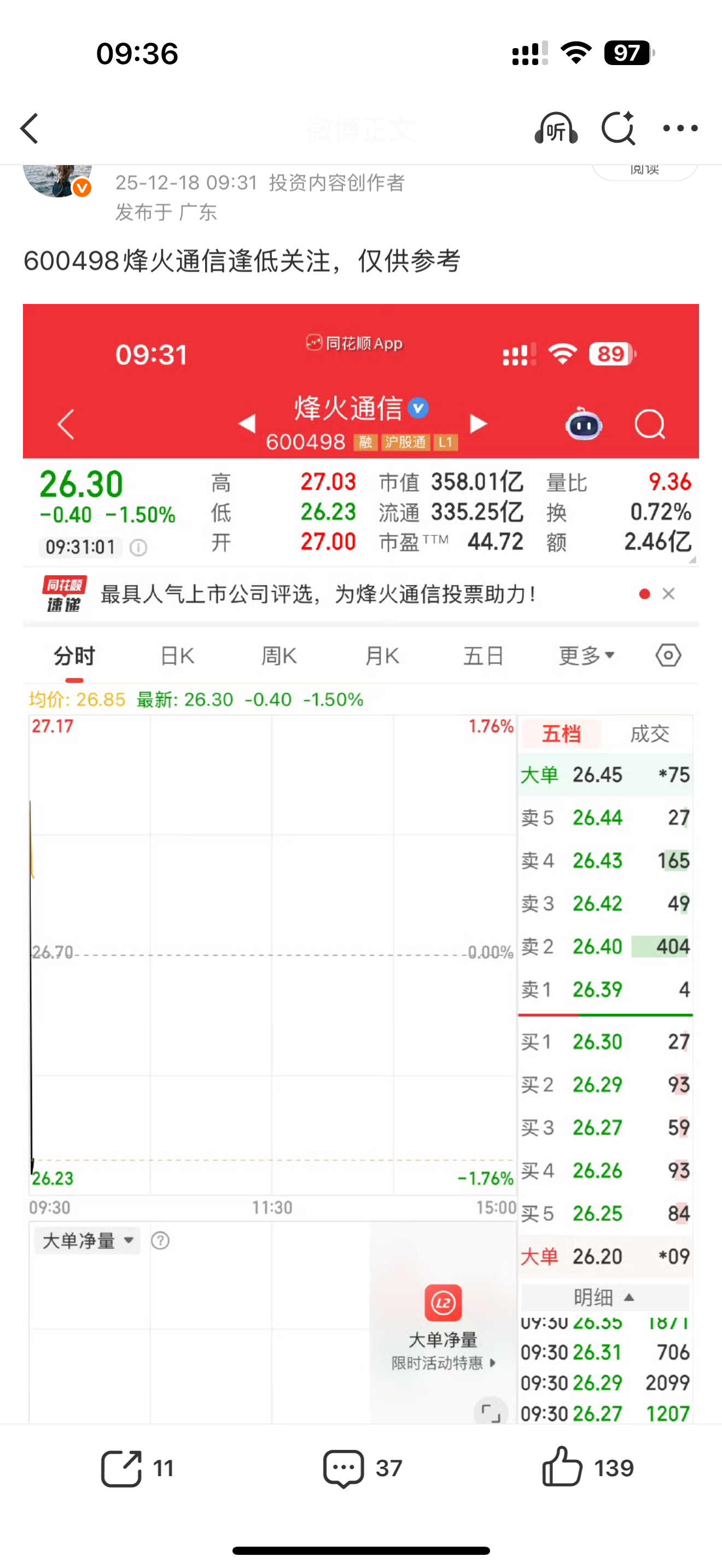 600498烽火通信继续大涨有在车上的兄弟姐妹们出来互动一波888观望没上车的一起抱团666