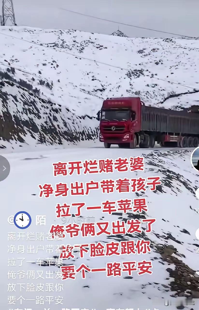这个男子离开了赌博的老婆,净身出户独自带着孩子,走在冰雪的路上拉了一大车苹果。有责任的好父亲,开着大货车还带着一个孩子走在这冰雪的路上,真的不容易。 男人以前是个顾家的,日子虽说不富裕,但一家三口守着小日子,也算安稳。谁成想老婆沾上了赌博,输光了积蓄不算,还欠了一屁股外债。男人劝过无数回,什么话都说了,她就是听不进去,男人心一横,只能选择分开。 他什么都没要,就抱着年幼的孩子,揣着兜里仅有的几百块钱,从那个冰冷的家走了出来。 为了活命,为了给孩子一口饱饭吃,他咬牙接了趟拉苹果的活,目的地是几百公里外的县城。遇上寒潮,天寒地冻的,路面结了厚厚的冰,车轮碾上去直打滑。驾驶室里的孩子,裹着他那件旧棉袄,缩在副驾驶座上睡得正香。 男人不敢开快,眼睛紧紧盯着前方的路,双手死死攥着方向盘。渴了就喝口保温杯里的温水,饿了就啃口干硬的馒头,困了就掐自己。他担心停下来了,会耽误交货时间,拿不到运费的同时,辛苦也白费了。 路过服务区的时候,他抱着孩子下车,给孩子买了个热乎乎的包子。孩子小口小口啃着,还懂事地把包子递到他嘴边,喊他吃。 那一瞬间男人眼眶红了,所有的苦和累都烟消云散了。只要能把孩子养大,让孩子好好做人,自己吃多少苦都是值得的。 男人心里知道,孩子是他的宝贝,是他活下去的希望。老婆走错了路,他不能让孩子跟着遭罪。这一路的冰雪再冷,也冷不过人心;这一车苹果再沉,也沉不过一个父亲的责任。 有人说他傻,净身出户还带着孩子,这辈子都别想轻松了。可是父爱如山,男子把爱全给了孩子。这个男人没什么大本事,不会说什么漂亮话,可是他用自己的肩膀,扛起了孩子的整片天空,为孩子创造出将来美好的生活。