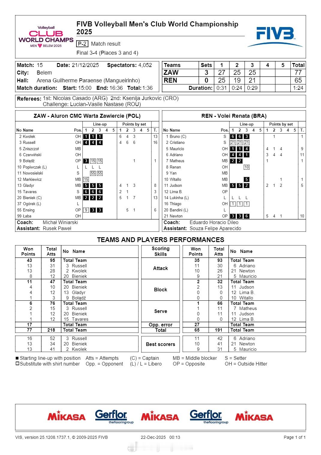 【男排世俱杯扎维尔切3-0完胜雷纳塔摘铜】国际排坛战报速递 12月21日巴西贝伦,2025男排世俱杯铜牌战,波兰扎维尔切3-0(27-25/25-19/25-21)完胜巴西雷纳塔。拉塞尔16分、科沃莱克和比涅克各13分,阿德里亚诺11分、纽顿10分。