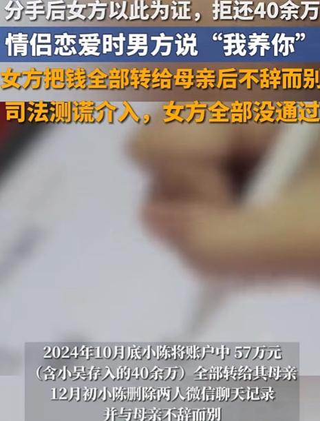 “把电影搬进了现实!”上海,男子和女同事互生好感,很快发展为情侣关系。同居期间,两人约定攒钱买房,男子每个月把收入转给女子的账户,还经常对女子说“以后我的钱都给你安排”“我养你”的甜言蜜语。不到一年时间他就转了将近40万,女子却只存入一小部分,男子觉得两人感情成熟,带女子见了父母,给她买了两万元的金手镯,父母也给了11200元的订婚金。万万没想到,此后没多久,女子带着他们买房的存款不辞而别,这段感情也宣告“破产”。男子气不过,把女子告上法庭要求退还这些钱,女子:你说过养我的,这些钱都用于日常开销了。法院仅用一招,就让真相浮出水面。 2023年10月,上海的写字楼里,小吴第一次对同事小陈动了心。 共事半年,两人一起赶过项目、一起加班吃外卖,默契像藤蔓一样悄悄生长,一次团建后的深夜聊天,他们捅破了那层窗户纸,正式走到了一起。 那时候的小吴,觉得日子有了奔头,他是个普通上班族,基本工资不高,但绩效奖金不稳定,好的时候一个月能拿几万。 而小陈性格温柔,偶尔会和他聊起“在上海有个家”的愿望,这话像一颗种子,在小吴心里发了芽。 三个月后,2023年12月,他们租了套一居室,开始了同居生活,搬家那天,小陈抱着他的胳膊说,咱们以后存钱买房吧,哪怕小一点也好。 小吴当场答应,两人商量着用小陈的身份证办了张银行卡,说好以后工资到账就往里存,谁都不能随便动。 从那天起,小吴成了“月光族”,不是乱花钱,而是把除了基本生活费之外的所有钱都转进那张卡里。 发工资的当天,他总会第一时间点开转账界面,有时候转1万2,有时候转3万8,看着卡里的数字一点点涨起来,他就觉得离“家”的目标又近了一步。 反观小陈,偶尔会转几百、几千进去,更多时候只是看着余额笑,说“有你真好”。 到2024年夏天,那张卡里已经有了57万,其中41万多都是小吴转的。 那些日子,小吴下班回家,常和小陈坐在沙发上刷房产中介的朋友圈,小陈会指着一套老破小说“这个地段方便”,小吴就记下来,盘算着再攒半年就能付首付。 变故是突然来的,2024年6月,小陈所在的公司裁员,她没躲过。那天她哭着回家,扑在小吴怀里说“我失业了,以后怎么办”。 但小吴拍着她的背,脑子一热就说了句,怕什么,以后我养你,可他没想到,这句安慰的话,会被小陈截图存在手机里,成了日后最伤人的“武器”。 失业后的小陈没再找工作,每天在家待着,小吴没说什么,依旧按时往卡里转钱,觉得自己多担待点是应该的。 2024年10月,小吴觉得两人感情稳定了,该谈婚论嫁了,就带小陈回了老家。 他父母见了小陈很满意,当场给了1万1千2的红包,说“这是订亲的心意”。 小吴也挺大方,回上海后给小陈买了个2万多的金镯子,又买了近3万的东西,跟着小陈去她老家拜访。 可那次去小陈老家,小吴心里很不是滋味,小陈的爸爸一直没出来见他,只有她妈妈陪着,中午就煮了两碗面条,连个菜都没有。 小吴心里不舒服,但没好意思说,只当是地方习俗不一样,回到上海没几天,小陈的妈妈就来上海了,说要照顾小陈,住进了他们的出租屋。 小吴觉得挤,但也没反对,可就在一周后,小吴想看看卡里的钱够不够付首付,点开手机银行一看,整个人都懵了,卡里一分钱都没了。 他赶紧查流水,发现57万全转到小陈妈妈的卡里了,他问小陈怎么回事,小陈说,我妈帮着存着,怕你乱花。 小吴有点生气,但看着小陈委屈的样子,又把火压下去了,只说“以后动钱得跟我说一声”。 可他没想到,这只是开始,2024年12月初,小吴下班回家,打开门就傻了,小陈的东西都没了,她妈妈也不在,屋子里空荡荡的,桌上没留一张纸条。 他赶紧拿手机给小陈发消息,发现自己被拉黑了,更让他崩溃的是,他手机里和小陈的聊天记录,全被删干净了,那些聊买房、聊未来的话,全都没了。 小吴这才反应过来,自己可能被骗了,于是他找朋友帮忙联系小陈,好不容易联系上了,要求她把钱还回来,那41万是他的血汗钱,还有订亲的红包、金镯子,加起来一共38万。 可小陈一口回绝,说“那些钱是你自愿给我的,你说过要养我”,没办法,小吴只能去法院起诉。 开庭那天,小陈拿出了那张“我养你”的截图,说小吴给的钱是“生活费”,还拿了几十张消费小票,说钱都花在两人同居上了。 她还说,金镯子已经还给小吴了,还以现金形式还了22万,小吴气得浑身发抖,他拿出自己电脑里备份的聊天记录。 法官看了证据,又听了双方的说法,提议做测谎,两人都同意了,然而小吴的回答全过了,小陈的全没通过。 法院最后判了,小陈得还小吴30万,还要承担大部分测谎费和诉讼费。 拿到判决书那天,小吴心里说不出的滋味,不是开心,是觉得寒心,他掏心掏肺想和这个人过日子,最后却被算计得这么惨。