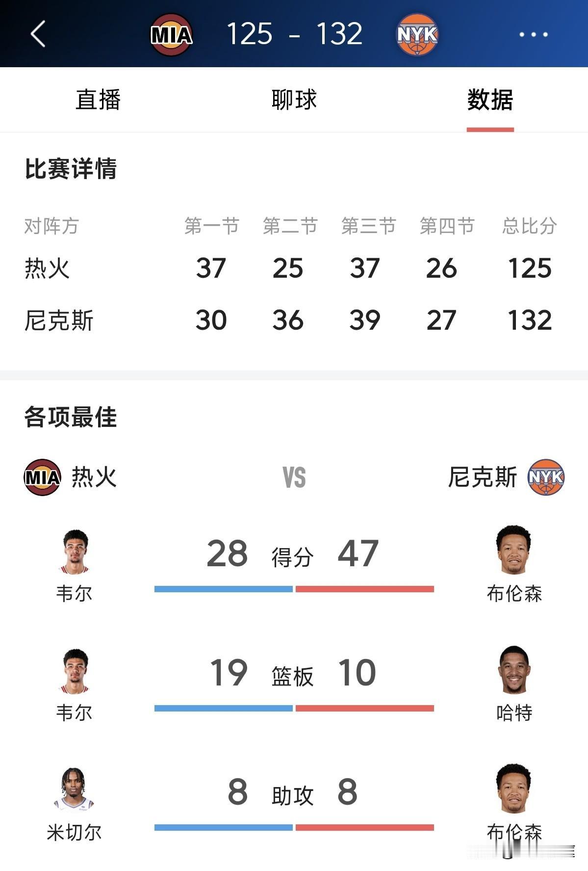距离10000分更近一步,布伦森在今天尼克斯主场132比125战胜热火比赛中,拿到了47分8助攻3篮板,布里奇斯拿到24分4助攻。热火队韦尔拿到28分19篮板。现在的尼克斯还是坐稳东部第二了,短期内他们排名不会有变化。