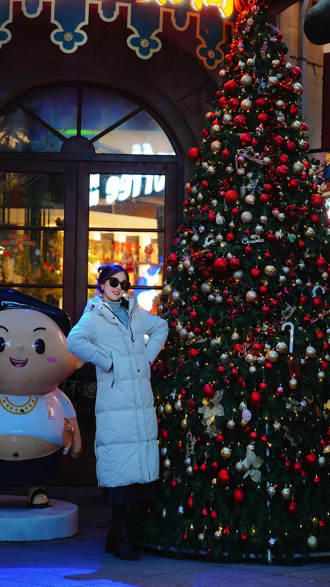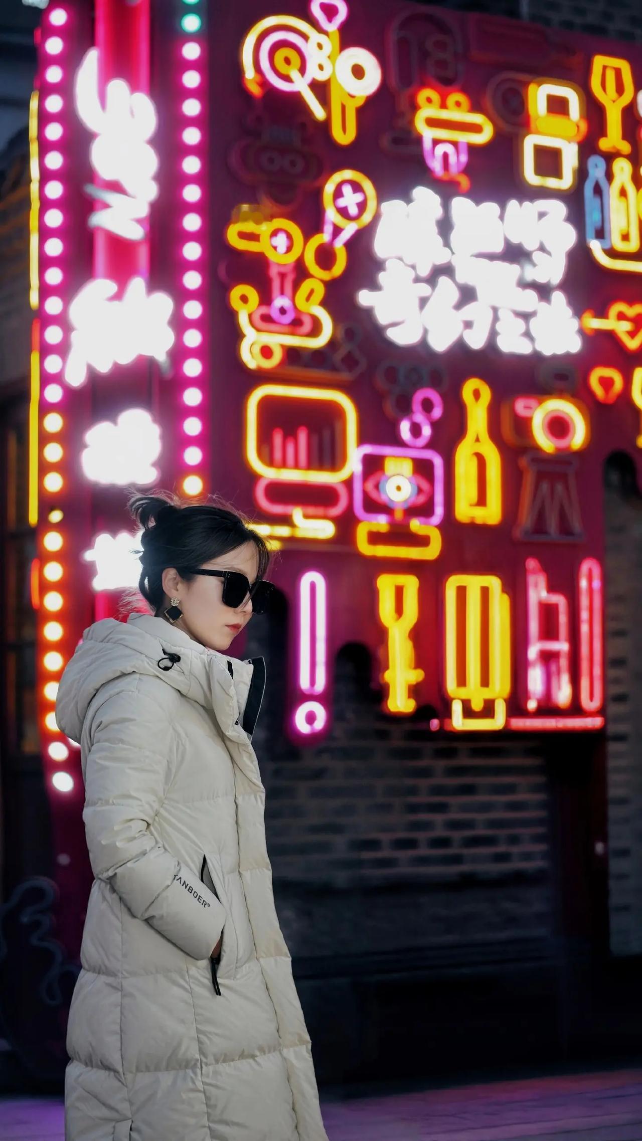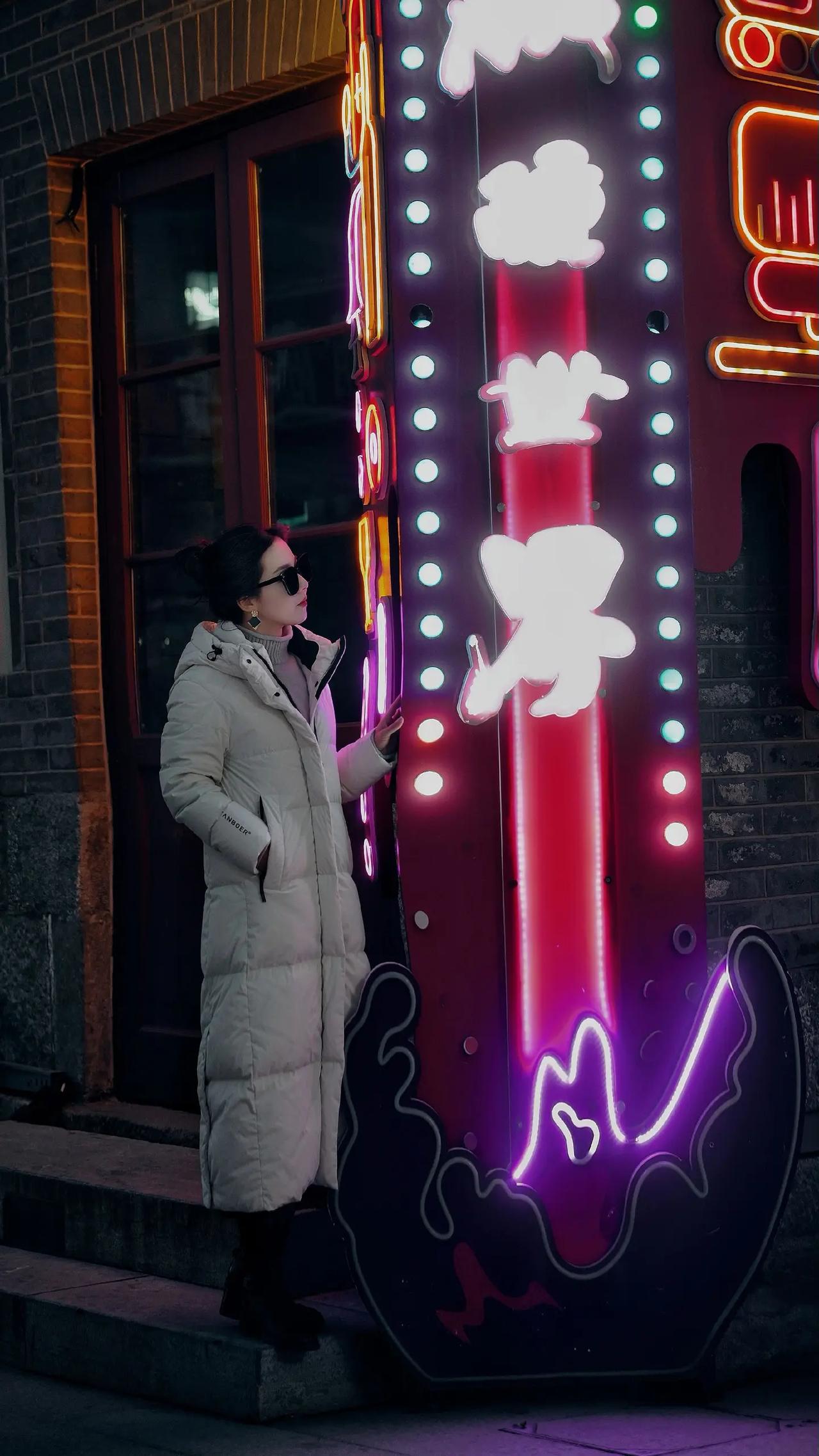 朝阳街 烟台山✨夜景出片天花板!霓虹灯下的氛围感杀疯了💥🧥长款羽绒服配墨