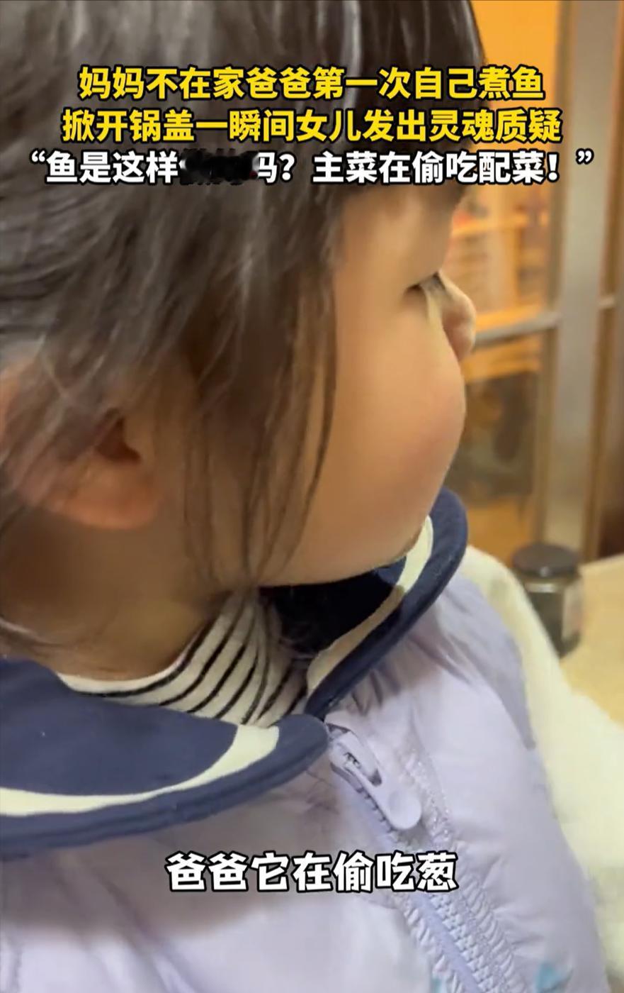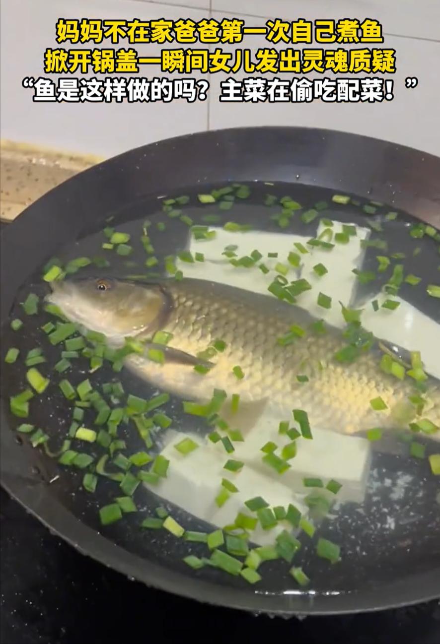 “一个敢问,一个敢答!”浙江,妈妈没在家,爸爸第一次下厨给女儿煮鱼吃,万万没想到,盖子掀开后,女儿看到锅里的鱼直接就懵了,询问爸爸说:鱼是这样做的吗?等爸爸回头一看,才发现锅里的鱼竟然在吃葱花。网友:打一个食材新鲜 事情发生在一个很普通的傍晚,天还没黑,厨房里的灯已经开了,老式抽油烟机嗡嗡响着,灶台上那口铁锅烧得很热,水刚开的时候,锅边还溅出几滴,落在台面上,很快就蒸干了。 鱼是下午刚买的,活的,装在塑料袋里拎回家,妈妈临时有事出门,交代了一句“你们自己解决晚饭”,人就走了。 家里剩下爸爸和女儿。孩子饿得快,隔一会儿就问一句“什么时候好”,爸爸嘴上答应得爽快,心里其实没底。 他平时不怎么进厨房,对做饭的理解也很简单:能煮熟就行,炖鱼在他看来不复杂,无非就是水、鱼、点配菜。 他把鱼拿出来,用水龙头冲了冲,鱼在水池里甩了两下尾巴,他下意识往后躲了一步,干脆也不折腾了,直接拎起来往锅里放。 没刮鳞,也没掏内脏,刀就放在案板上,几乎没派上用场,锅里加了不少水,切豆腐的时候还算认真,一块一块下得不太均匀。 葱是现成的,随手抓了一把,撒进去,锅盖一扣,火一开,爸爸拍了拍手,像是完成了一件挺了不起的事。 女儿一直站在门口看,她也不太懂做饭,但总觉得和平时妈妈做的不太一样,锅里的水开始翻,声音越来越大,水汽往上冒,把爸爸的眼镜都熏得有点花。 就在这个时候,女儿发现不对劲了,她盯着锅里看了几秒,发现那条鱼的位置在变,鱼嘴一张一合,随着水的翻滚,看起来特别明显。 刚好一段葱在水面晃来晃去,碰到鱼嘴边,又被水推开,再晃回来,孩子忍不住喊了一声:“爸爸,鱼在吃葱。” 这一声挺突然的,爸爸愣了一下,还以为孩子看错了,凑过去一看,自己也沉默了,画面确实有点说不上来:鱼没完全静下来,嘴还在动,看着就不像是已经“认命”的样子。 他第一反应明显有点慌,手在锅边停了两秒,像是在想要不要关火、要不要捞鱼,最后却直接把锅盖一盖,盖得还挺快。 “别看了,马上就好。”他说,锅盖盖上以后,厨房里只剩下水声,女儿站在旁边憋着笑,又有点不太确定是不是自己看错了。 后来这段画面被拍下来传到网上,很多人看了都笑,有人说鱼这是“临终前还要补一口”,也有人说这操作实在太生猛,连基本步骤都没走完。 但如果真放在生活里,其实一点都不稀奇,很多爸爸都是这样,不是不用心,而是不熟,菜刀拿得别扭,火候掌握不好,做什么都慢半拍,还容易紧张。 这位爸爸也是,他站在灶台前的时候,动作明显比平时在家里干别的事要小心,怕溅油,怕搞砸,嘴上不说,心里一直绷着。 那顿饭后来怎么样,其实已经不重要了,鱼最后大概也没怎么吃,味道想想就知道,但那天的画面,反而成了家里很容易被提起的一件小事。 对孩子来说,那不是一道失败的菜,而是一次很具体的陪伴,她看到的是,妈妈不在的时候,爸爸也会站出来,哪怕不熟练,也愿意试。 当然,从现实角度说,做饭这件事,光有心是不够的,基本的处理和卫生还是得学,但生活里很多瞬间,本来就不完美。 有时候,一口翻滚的锅里,装着的不只是没处理好的鱼,还有一个人笨手笨脚地想把“该做的事”做好,这种不太体面的认真,其实也挺难得的。