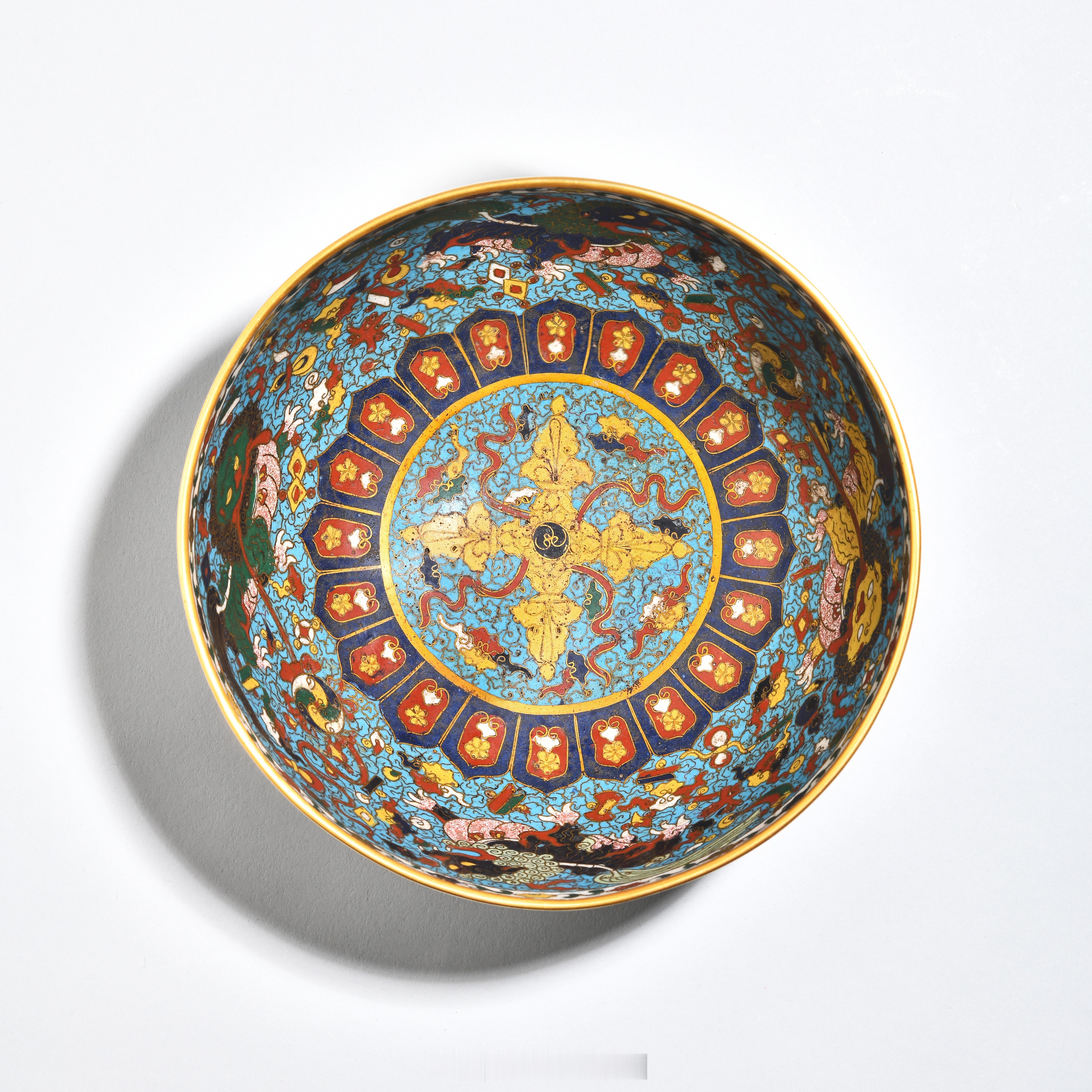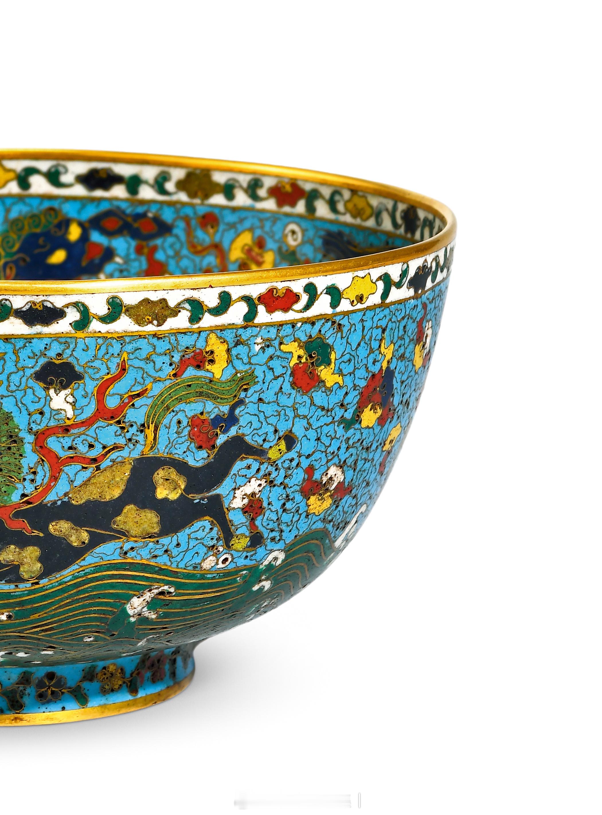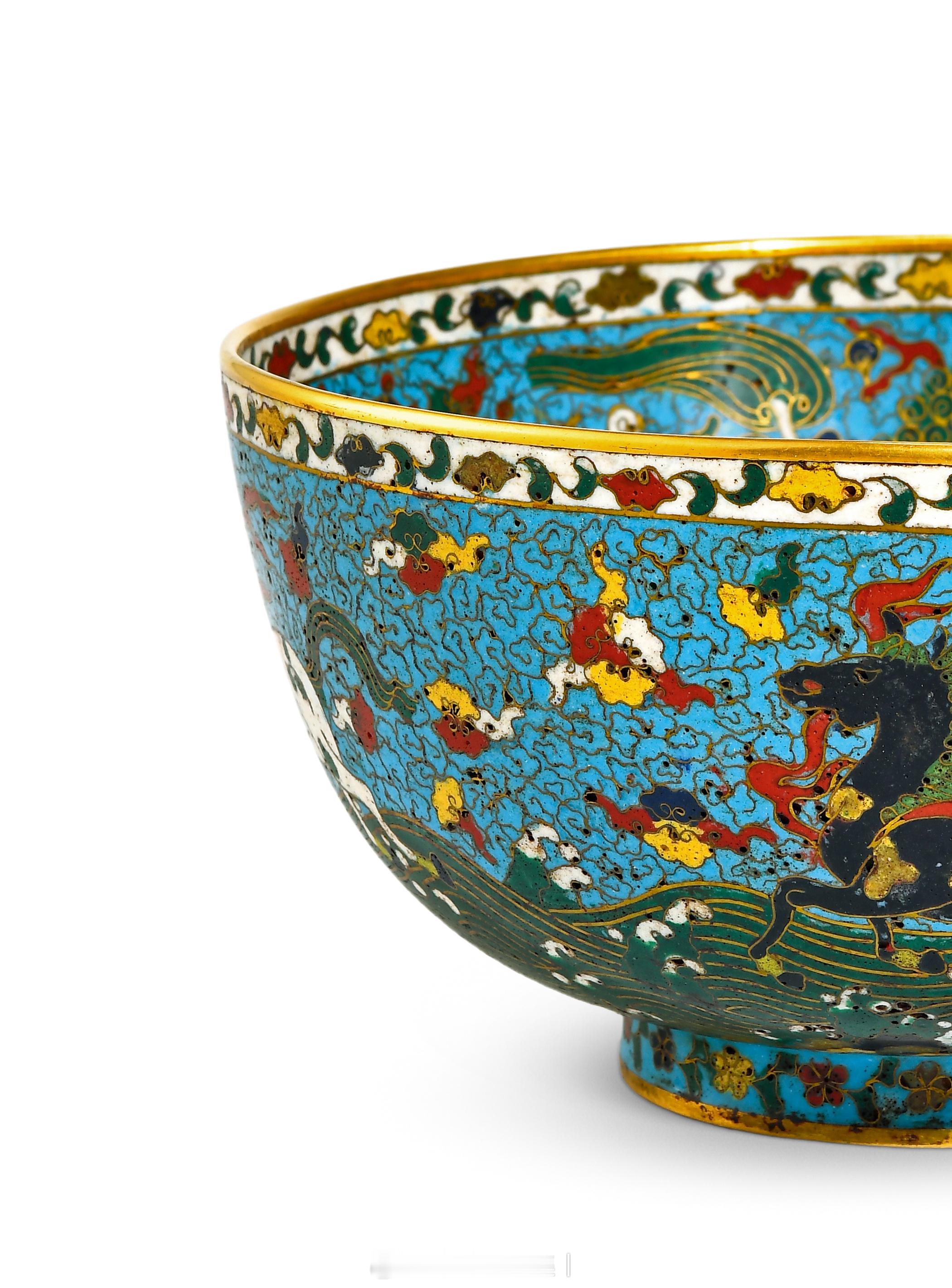 明成化 掐丝珐琅海马纹碗此件铜胎掐丝珐琅碗,属明代典型器式,造型规整,尺寸逾同类器物,制作工艺精良。碗敞口,腹壁弧收,腹底顺势圜收,下承矮斜圈足,口沿与底足均饰鎏金一周,金层璀璨厚重,与釉色形成鲜明质感对比,色泽明快而不失沉穆。通体以天蓝釉为地色,釉面莹润均匀。口沿内外环饰五彩卷草纹,纹样缠绕连绵,线条流畅细腻。内壁以掐丝狮子滚绣球纹为主体,黄、黑、绿、蓝四色瑞狮造型憨态可掬,绣球配红色彩带舞动其间,间以祥云纹、葫芦纹铺陈背景,纹样繁而不乱。碗内底以一道鎏金弦纹开圆光,开光内饰金色十字杵纹,开光外环绕仰莲瓣纹,层次分明,纹饰布局严谨对称。碗外壁则饰白、黑、深蓝、黄四色海马纹,海马踏绿色海浪驰骋奔腾,动态十足,空白处填饰各色如意云纹,与内壁纹样形成内外呼应的整体感。作为 “燕京八绝” 之一的铜胎掐丝珐琅,又称 “景泰蓝”,其原料珍稀、工艺繁缛,凭借瑰丽釉色与熠熠鎏金,成为宫廷专属用器。如本品般纹样与器型的同类品存世稀少,现可见一例本品在器型与纹饰上几近相同者,清宫旧藏明中期景泰款铜胎掐丝珐琅海马狮戏球纹碗。碗外壁海马纹是中国传统经典纹饰,据目前研究资料表明,海马纹饰最早可见于元代青花瓷,本品所饰海马图另与《元史·舆服二》所载“玉马旗,赤质,青火焰脚,绘白马,两膊有火焰”的描述基本吻合,典例可见牛津大学阿什莫林博物馆藏元青花缠枝牡丹海马纹兽耳罐。北京匡时2013年一件明中期 铜胎掐丝珐琅海马纹碗,以57万余万元成交,而本品纹饰相较前者更为灵动鲜活,细节处更显精工,收藏价值不言而喻。尺寸:直径18.3cm;高9.5cm来源:中贸圣佳2025秋季三十周年庆典拍卖会《集萃——古董珍玩专场》