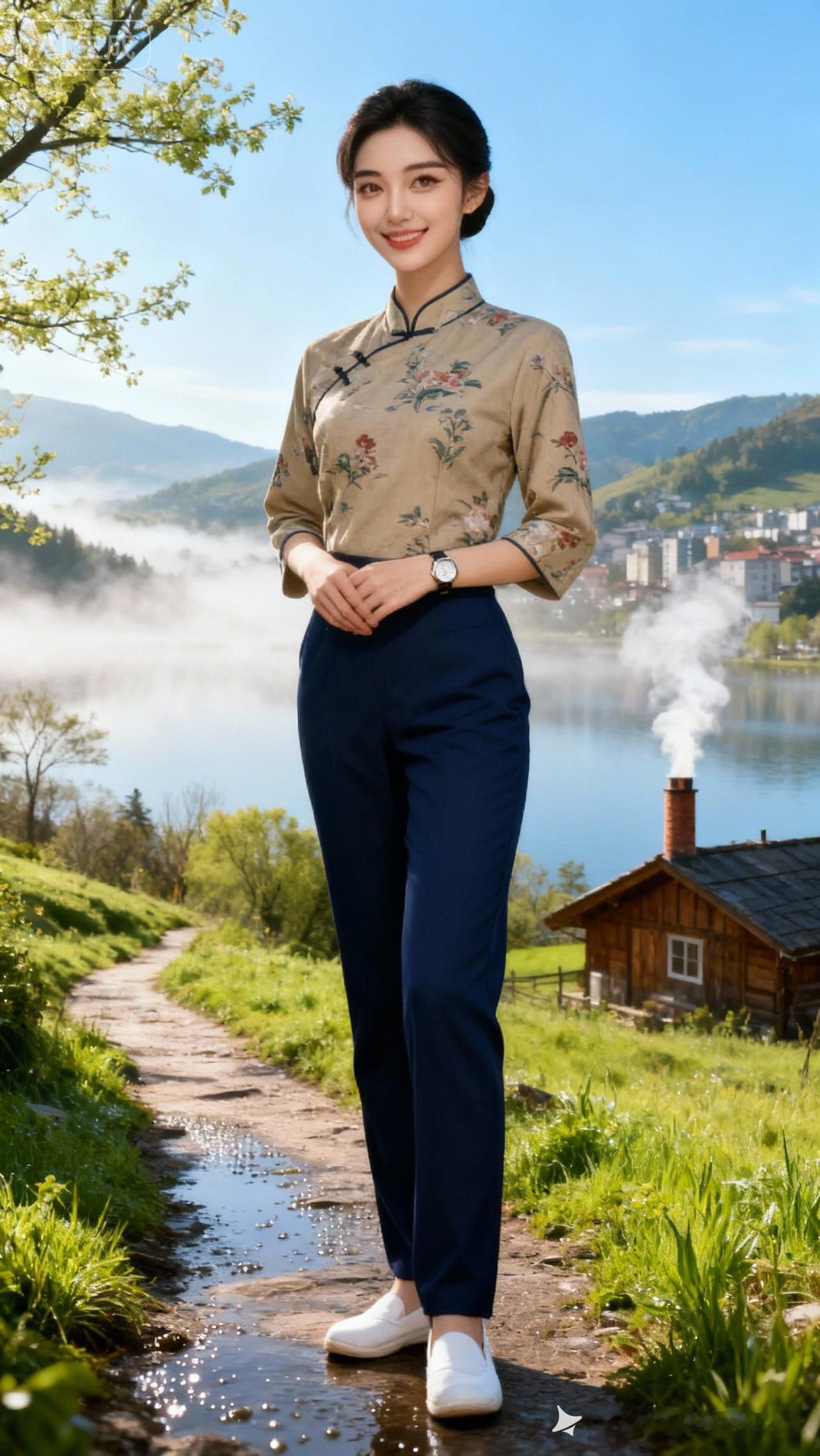 山风裹着红衫来晨雾刚漫过山峦的轮廓,她轻倚在护栏旁,像枝桠间坠着的红枫,浸