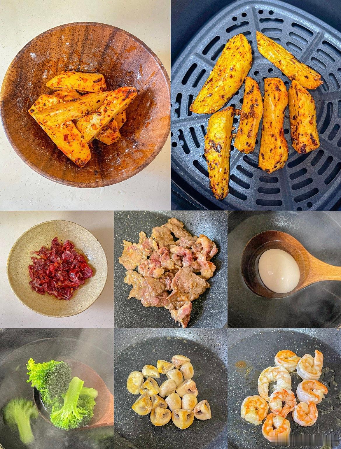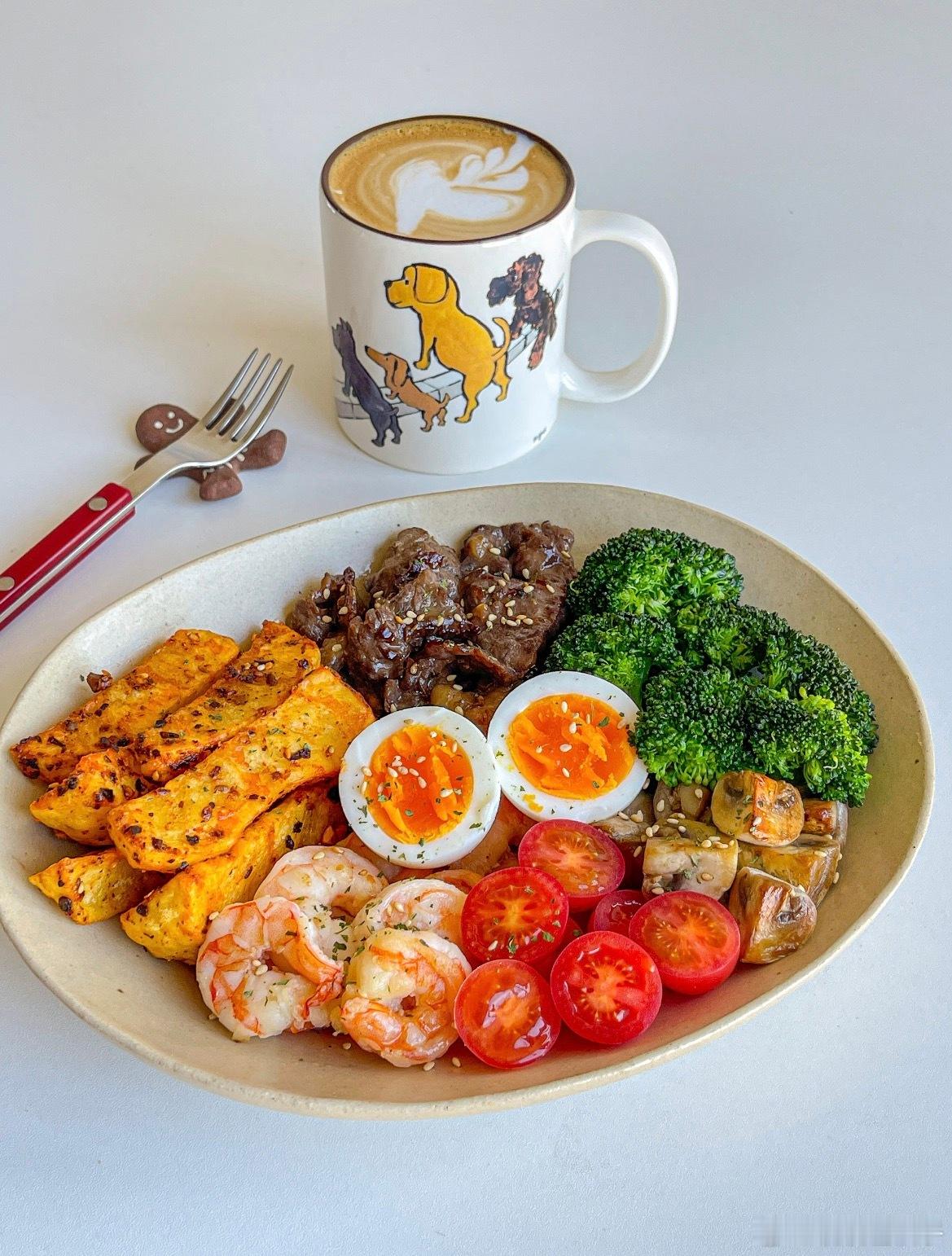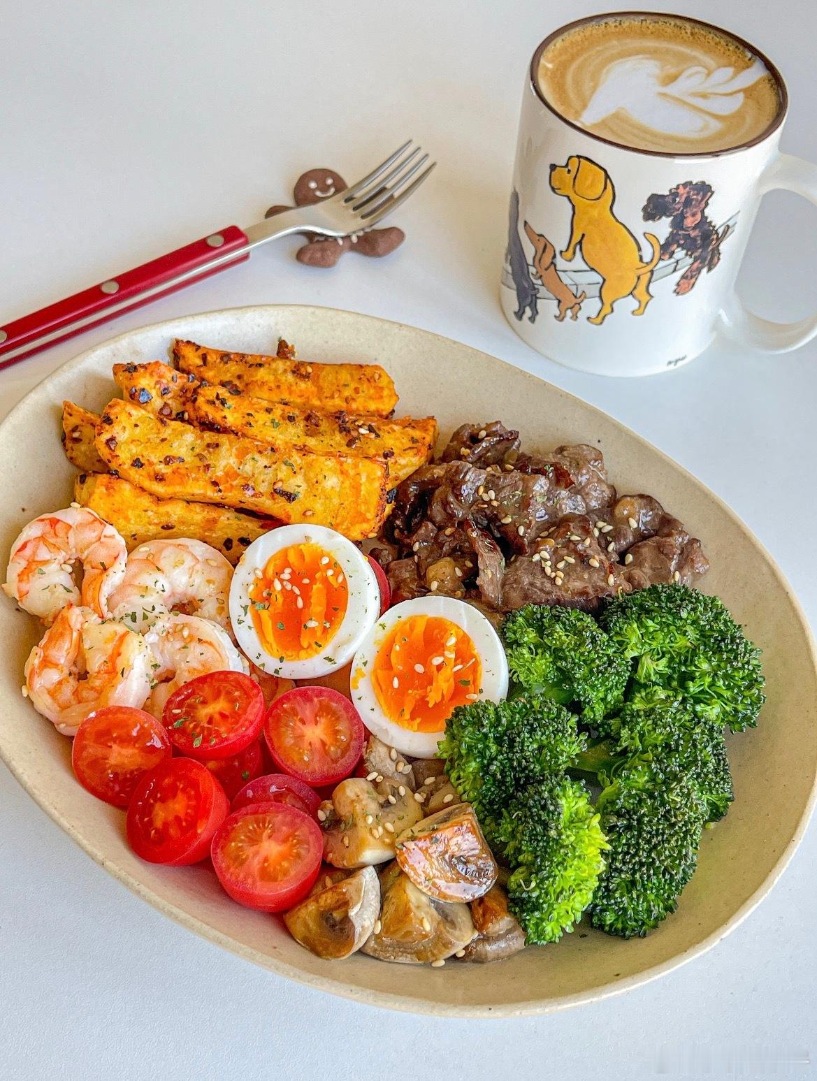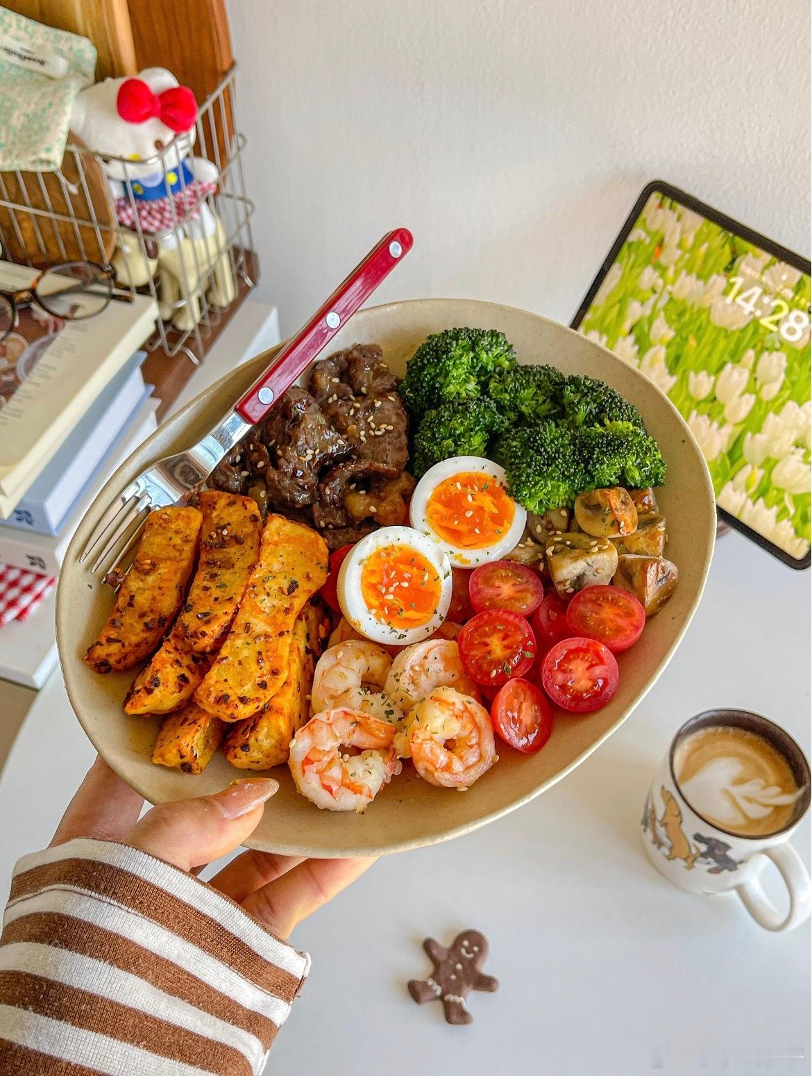 琥珀金薯伴炙烤双珍 管理期也要吃好吃的饭💯香喷喷的一盘 营养均衡又美味食材:🥗烤薯条➕西蓝花➕溏心蛋➕圣女果➕口蘑➕牛肉➕虾仁步骤:🥗1️⃣土豆切条用黑椒,海盐,辣椒粉调味 空气炸锅180度18分钟,2️⃣牛肉用黑椒,海盐,生粉,生抽抓拌均匀 喷一层橄榄油 煎熟3️⃣鸡蛋用沸水煮7分钟 捞出过凉水去壳对半切 西兰花焯水 口蘑和虾仁煎熟即可秋冬就喜欢这种温热沙拉 营养均衡又美味!!组个冬日养生局 温暖的食光 兴趣稀引力计划
