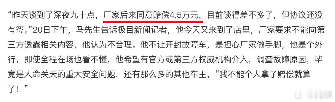 没想到这事还有后续,小伙要求赔偿精神损失费,而厂家居然也大体同意了,要求是保密高速狂奔490公里司机要求退车退款厂家代表回应狂奔490公里司机索赔狂奔490公里司机索赔5万精神损失费