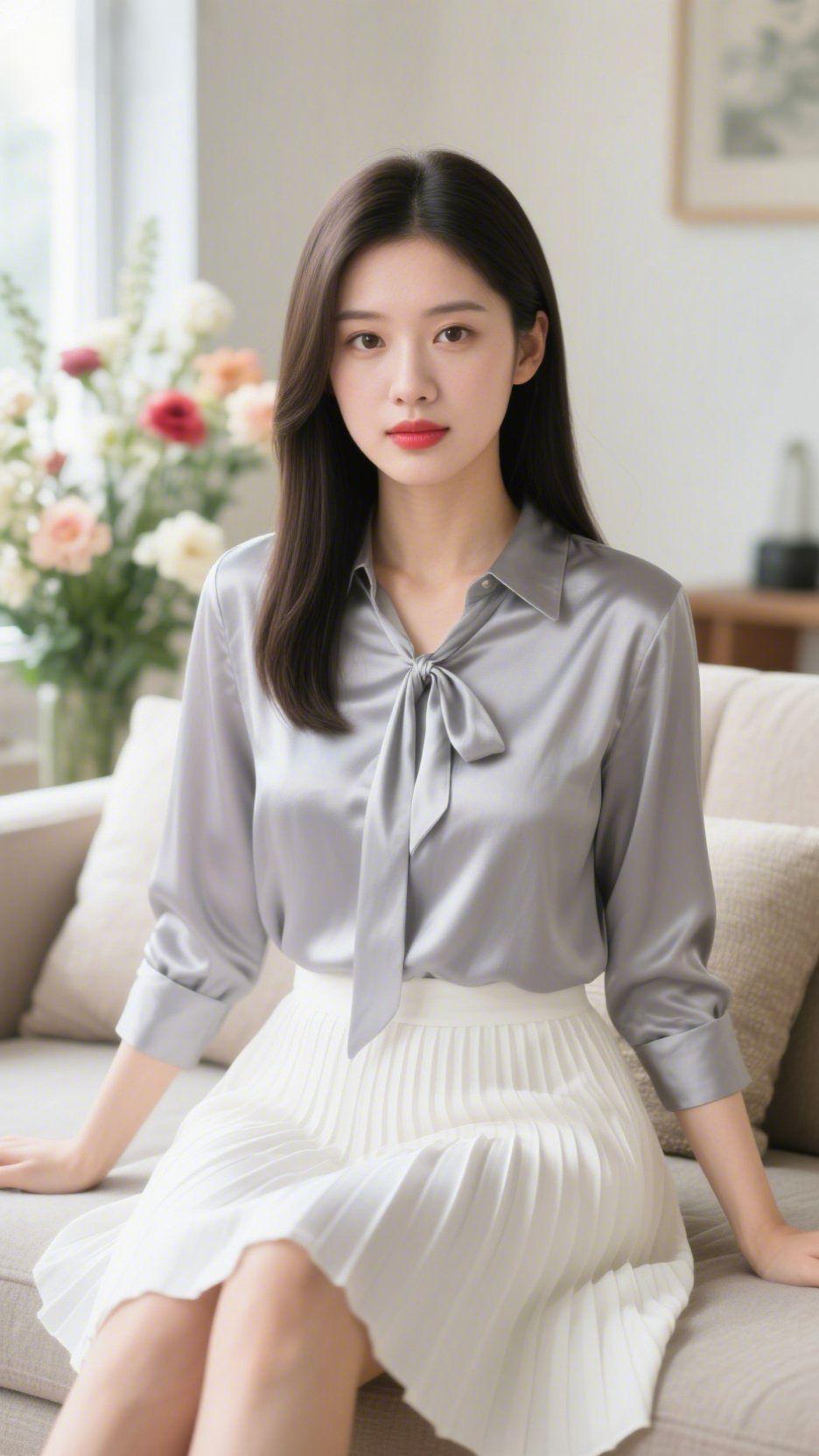 室间里的浅灰温柔 暖光裹着室间的静,她坐在沙发上,浅灰衬衫缀着轻软的结,同白裙的褶纹相融,像把春日的柔浸在了衣间。发梢垂着轻弧,唇色轻暖,周遭花影也漫开妥帖的舒展。 软榻衬着淡色绒感,她的身影落进光影里,仿佛把日常的平淡,滤成了这一身的雅柔。原来寻常的室间,也可以裹着轻雅的意,是静处时漫开的、恰好的温柔。 室间浅灰雅柔 日常轻暖穿搭