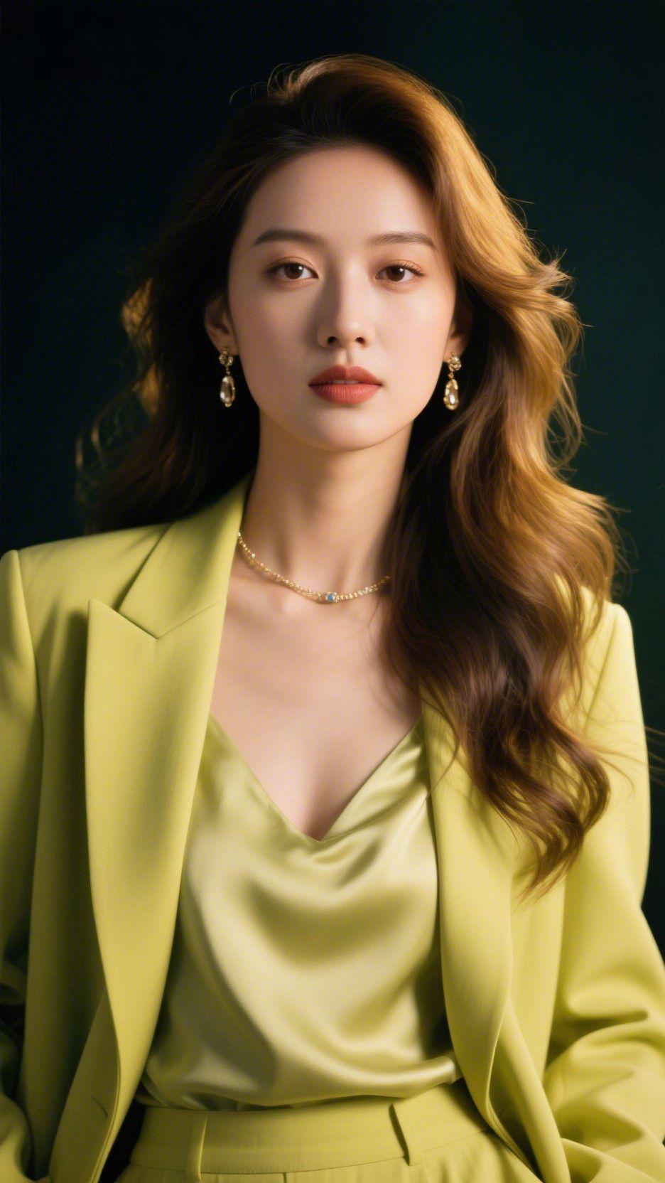 墨境中的浅黄柔明 深墨般的静境里,她立于光下,一身浅黄像揉进了晨雾的暖。西装的挺括衬着内搭的柔润,颈间细链缀着星点微光,发梢轻卷,气息里漫着舒展的妥帖。 光影落于衣料,晕开软而细的质感,唇色轻暖,眼尾凝着静柔的光——仿佛将周遭沉暗,都滤作这抹浅黄里的明润。原来冷调的境,亦可裹着暖调的意,是静处时漫开的、恰好的生动。 浅黄西装柔润感 静境暖调穿搭