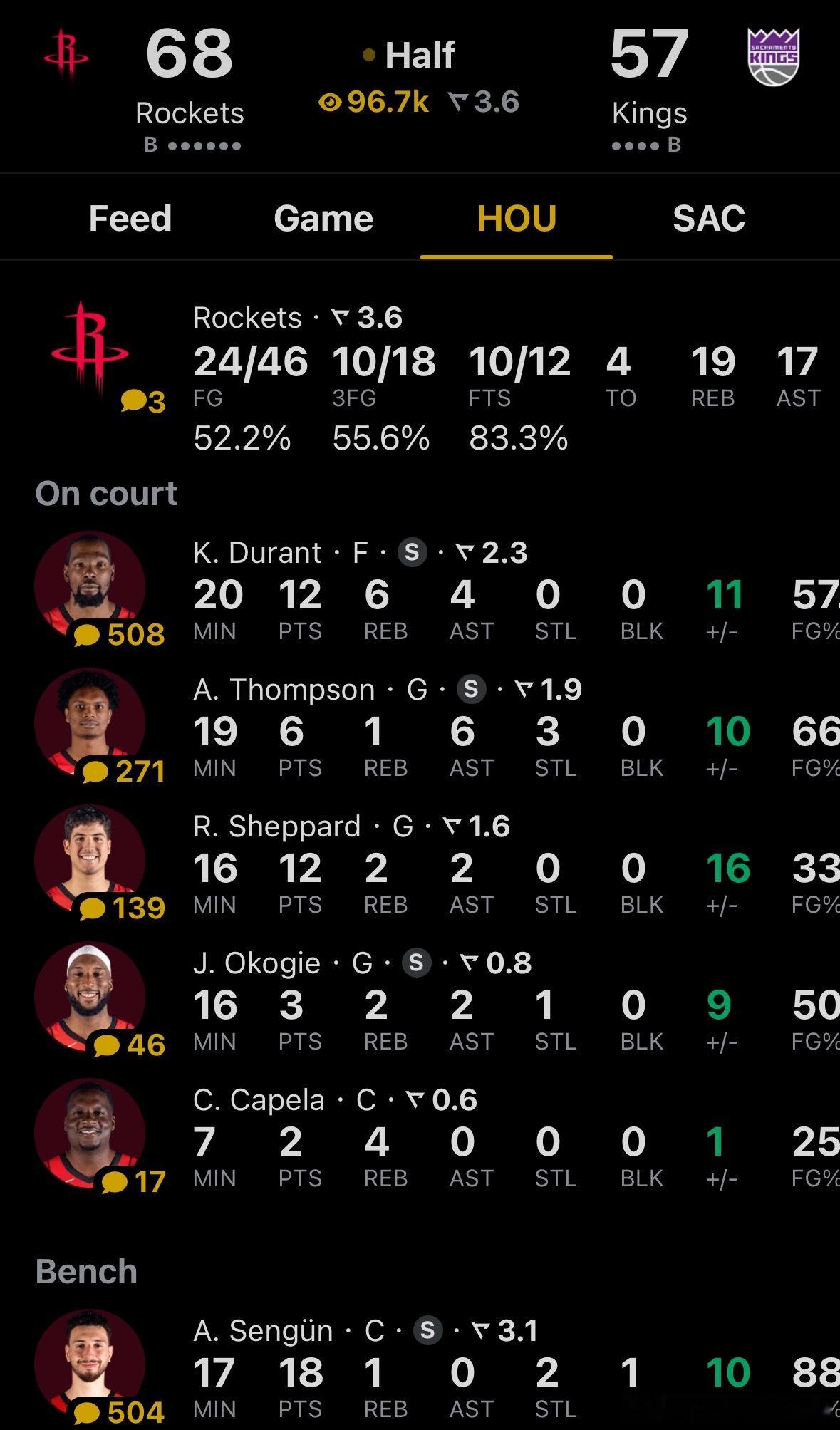 半场结束,火箭68比57领先国王🚀申京18分2抢断杜兰特12分6篮板4助攻谢泼德12分伊森9分火箭vs国王休斯顿火箭休斯顿火箭