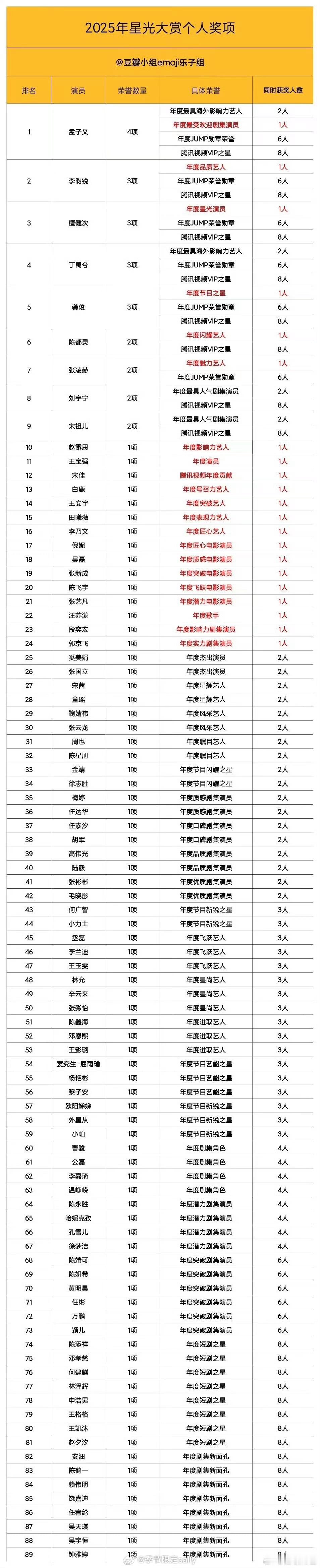 腾讯星光大赏个人奖项统计,孟子义获四项荣誉位列第一,李昀锐、檀健次、丁禹兮、龚俊获得三项荣誉并列第二