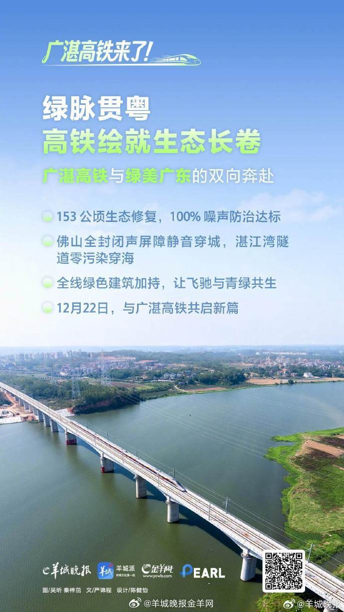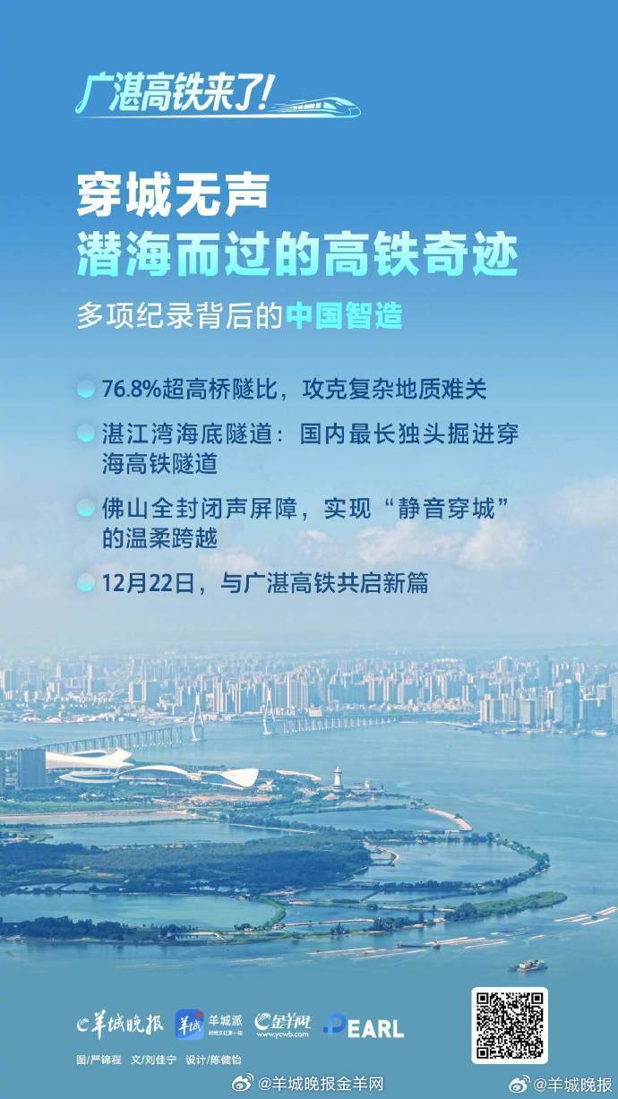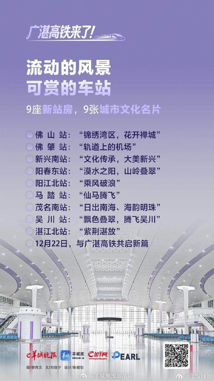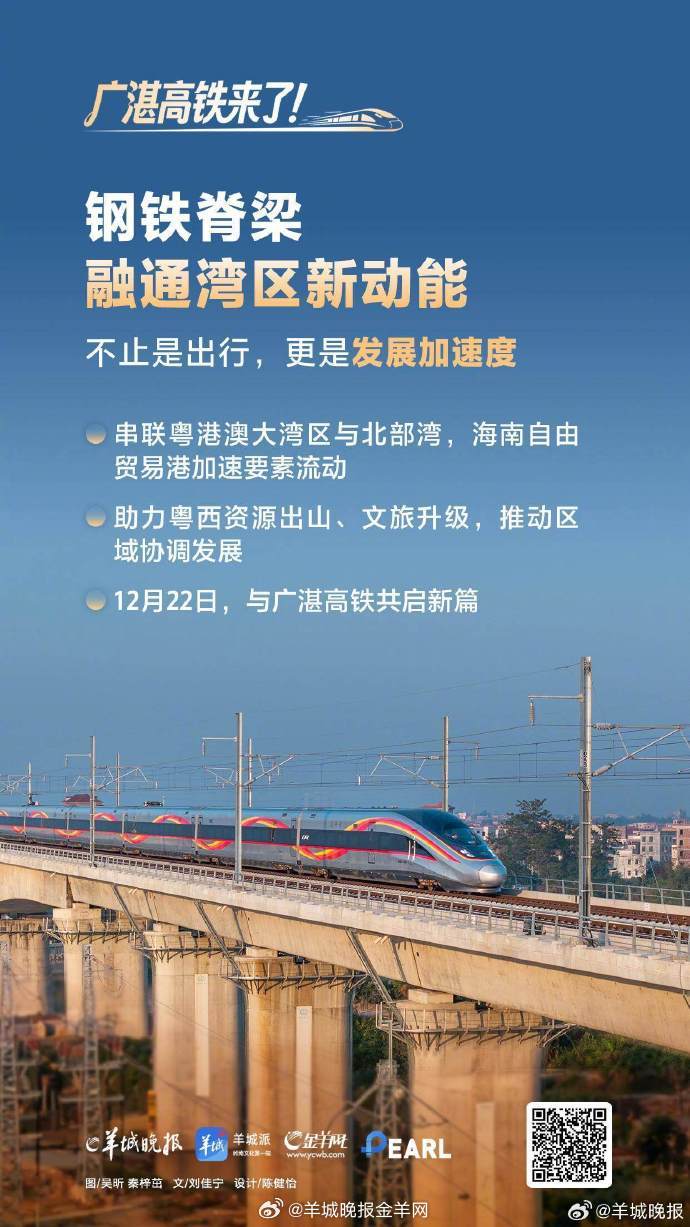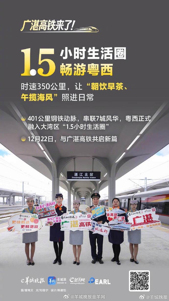 【#乘着广湛高铁出发吧#】12月22日,广湛高铁正式开通。据悉,广湛高铁是国家“八纵八横”高速铁路网、时速350公里沿海高速铁路通道的重要组成部分,于2019年9月开工建设,项目全长401公里,全线新建佛山、佛肇、新兴南、阳春东、阳江北、马踏、茂名南、吴川、湛江北等9座车站,预留阳西站和湛江东站。项目开通后,广州至湛江的通行时间由3小时左右缩短至1.5小时左右,有效改善粤西地区群众出行条件,对发挥粤港澳大湾区辐射带动作用、促进粤西地区高质量发展,推动粤港澳大湾区与北部湾经济区、海南自贸港互联互通具有重要意义。