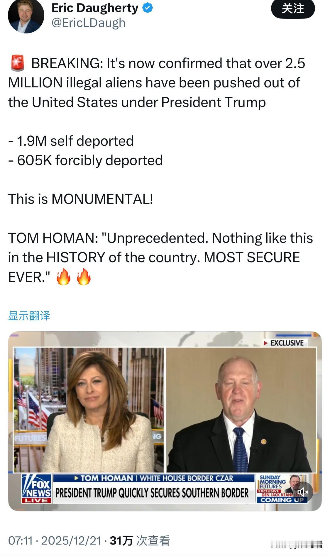 突发新闻:现已证实,在特朗普总统的领导下,已有超过250万非法移民被驱逐出美国。 - 190万人自行遣返 - 60.5万人被强制驱逐出境 这真是意义重大! 特朗普政府的“边境沙皇”(Border Czar)汤姆·霍曼盛赞:“史无前例。国家历史上从未有过这样的情况。史上最安全。”
