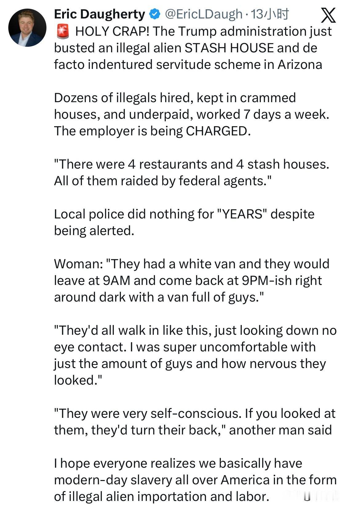 根据2025年12月的最新报道,联邦特工在亚利桑那州针对涉及“事实上的契约奴役”和非法移民藏匿点的行动主要涉及两个独立的重大案件: 1. 凤凰城东谷寿司店人口贩运案 (2025年12月) 2025年12月中旬,联邦探员突袭了位于大凤凰城地区(East Valley)的4家餐厅和4个藏匿窝点(Stash Houses)。 涉案机构: 包括 Sakura Sushi(位于吉尔伯特、梅萨和凤凰城)以及 Akita Sushi(位于斯科茨代尔)。 指控内容: 该连锁店的老板(美籍华人)及其两名经理被指控雇佣数十名非法移民,并将他们安置在拥挤的藏匿点中。 生存状况: 调查显示,这些劳工被要求每周工作7天,没有休息日,且工资极低。他们每天由白色面包车往返接送于住处与餐厅之间。 最新进展: 涉案人员已被逮捕并面临窝藏及非法雇佣外籍人士的联邦指控,听证会定于2025年12月30日举行。 2. 图森“Taco Giro”餐厅突袭行动 (2025年12月) 另一场规模更大的行动发生在2025年12月5日,针对南亚利桑那州的跨国犯罪组织。 规模: 联邦特工执行了16项搜查令,突袭了9家餐厅(主要是 Taco Giro 连锁店)和7个藏匿窝点。 逮捕情况: 共有46名非法移民被捕,其中部分人有性侵或非法入境的前科。 冲突事件: 在图森的突袭过程中,超过100名抗议者试图阻挠执法,甚至发生袭警和破坏政府车辆的暴力行为。美国国会议员 Adelita Grijalva 也出现在现场并引发争议。 这两起案件均反映了2025年下半年联邦执法部门(如 ICE HSI)在亚利桑那州加强对“劳动力剥削”和“人口走私”类犯罪组织的打击力度。