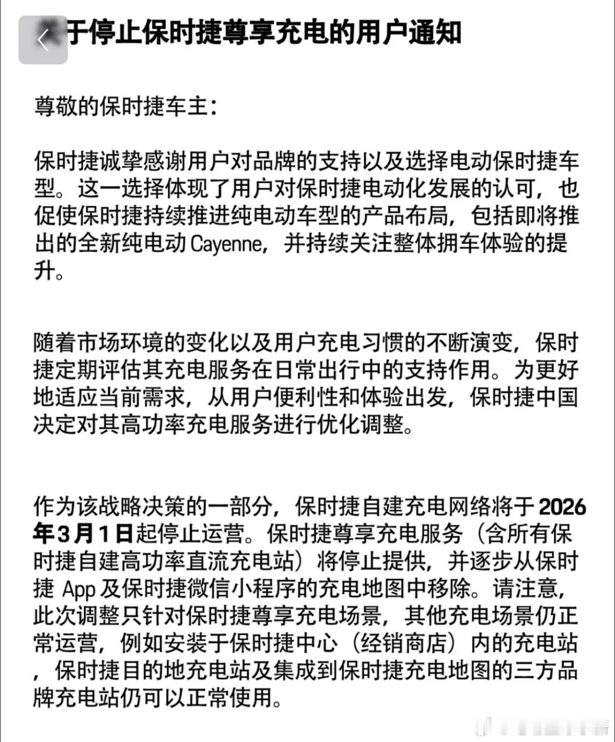 保时捷自建充电网络将于 2026 年 3 月 1 日起停止运营。届时,“保时捷尊享充电服务”(包括所有保时捷自建的高功率直流充电站)也将下线,并陆续从保时捷 App 和微信小程序的充电地图中移除。自建充电站如果只服务自己品牌,很难做大规模,更难真正形成一张“网”,最后走到这一步并不意外。反而会更佩服那些咬牙把桩建下去,还愿意对其他品牌开放的车企。保时捷新能源车企