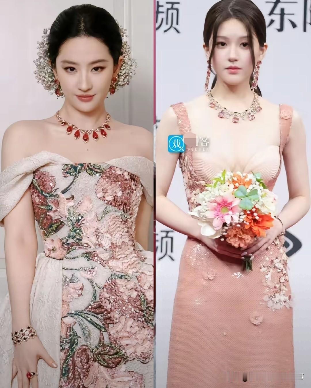 刘亦菲和赵露思同样是佩戴宝格丽珠宝,呈现效果真的不一样,说句95花还是比不过85花,应该没人有异议吧? 刘亦菲这边真的赢麻了!自带大气范儿,珠宝在她身上更像锦上添花的点缀,完全不会抢风头,让人第一眼就锁定她的脸和气质,妥妥的“人戴珠宝”,而不是“珠宝戴人”。 再看赵露思,这次的造型搭配确实有点拉胯。耳坠和项链几乎连到肩膀,直接拉低了脖子的视觉长度;两缕刘海长短过于一致,又厚又长,把脸部线条切割得很生硬,对称感反而显得呆板;文胸设计的裙子尺寸也不太适配,比例看着有点失调,要是文胸部分小一点、短一点,应该能更好地拉长腰线。而且韩妆妆容显得没什么精气神,那两缕厚重的鲶鱼须刘海,要是弄上去估计会好很多。整体看下来,大家的注意力都被繁复的珠宝和造型细节吸引,反而忽略了她的脸。 只能说这次同品牌珠宝佩戴,刘亦菲的大气感真的完胜,赵露思还是差了点意思。 你们觉得谁更能hold住宝格丽珠宝的气场?