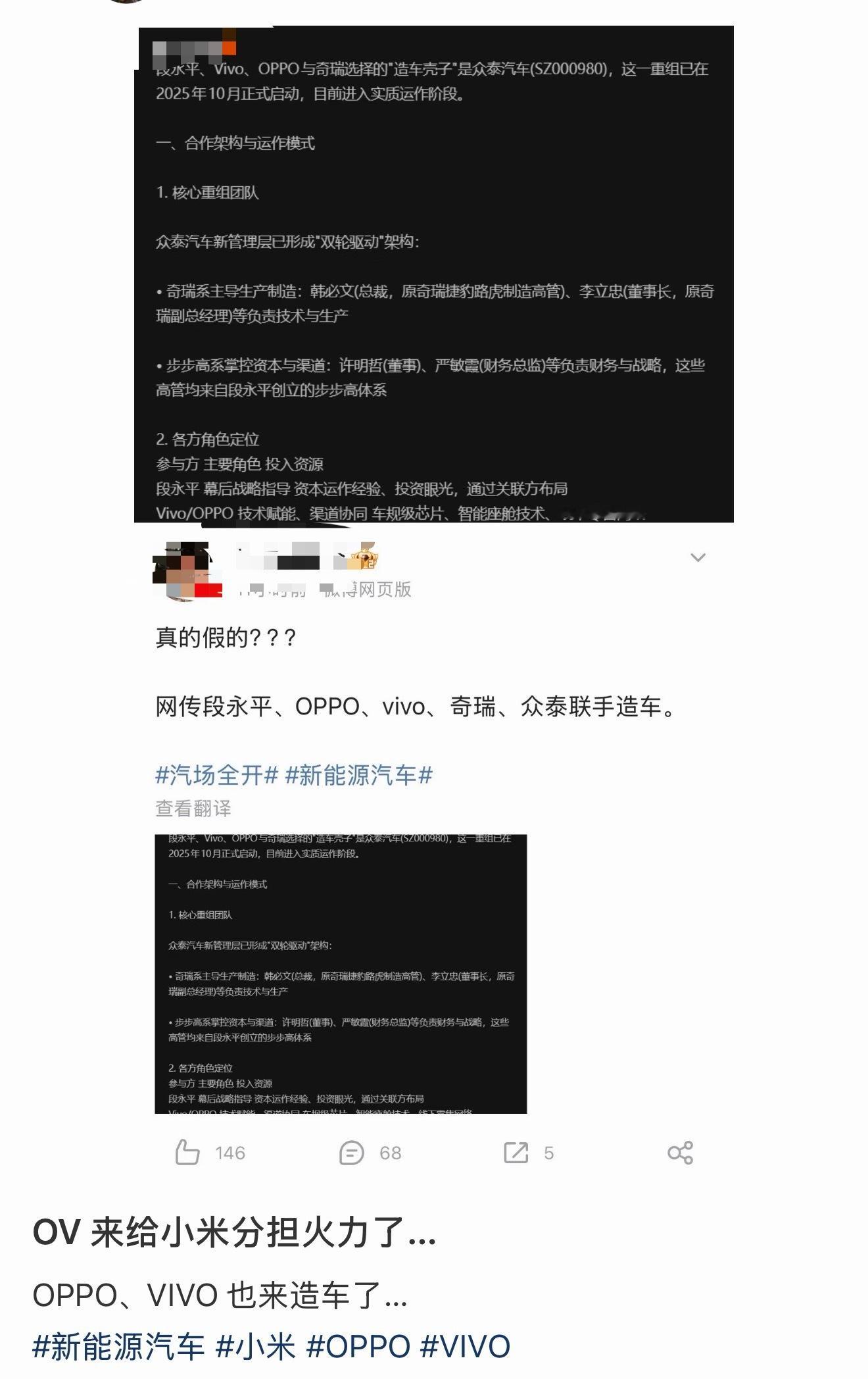 最近都在传段永平携OV造车,鉴于最近段永平频繁出现在大众视野,感觉是要在国内布局新的产业了,但是说OPPO vivo造车,我觉得不可能,如果进入汽车领域应该也是步步高系的人员具体执行,OV两家公司和段永平作为投资方,携手奇瑞是个很好的选择,既有造车资历,也有和三方合作造车的经验。如果说OPPO vivo单纯一家造车还是太薄弱了,那步步高系深入造车还是很值得期待的,特别是步步高创始人段永平这位投资界传奇人物牵头,感觉底下这帮门徒对于前景也会更看好。如果再把众泰这个破产重组的车企盘活,对中国汽车产业也是好事,所以明年的中国车圈还是很有看头啊。