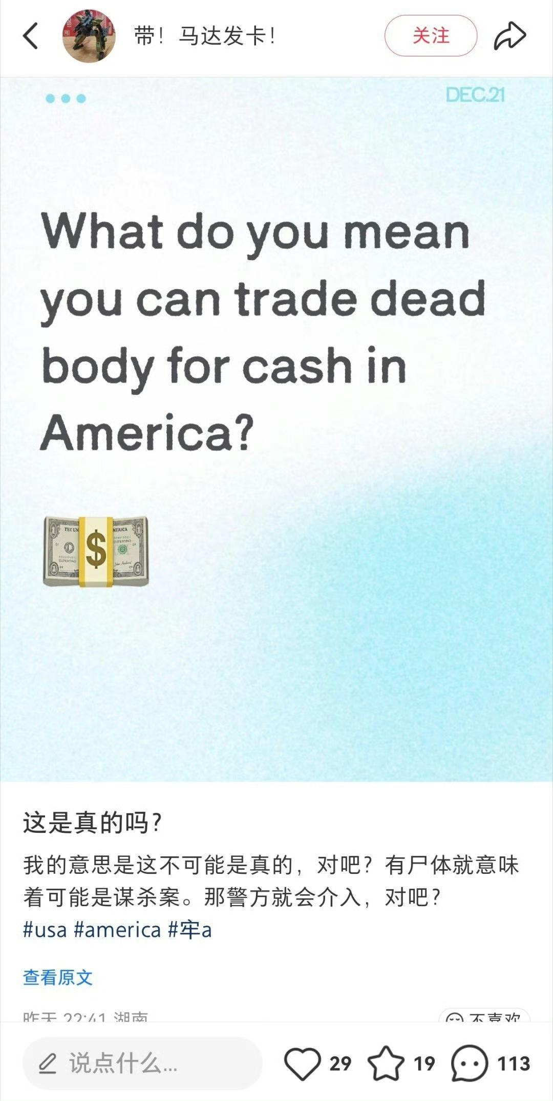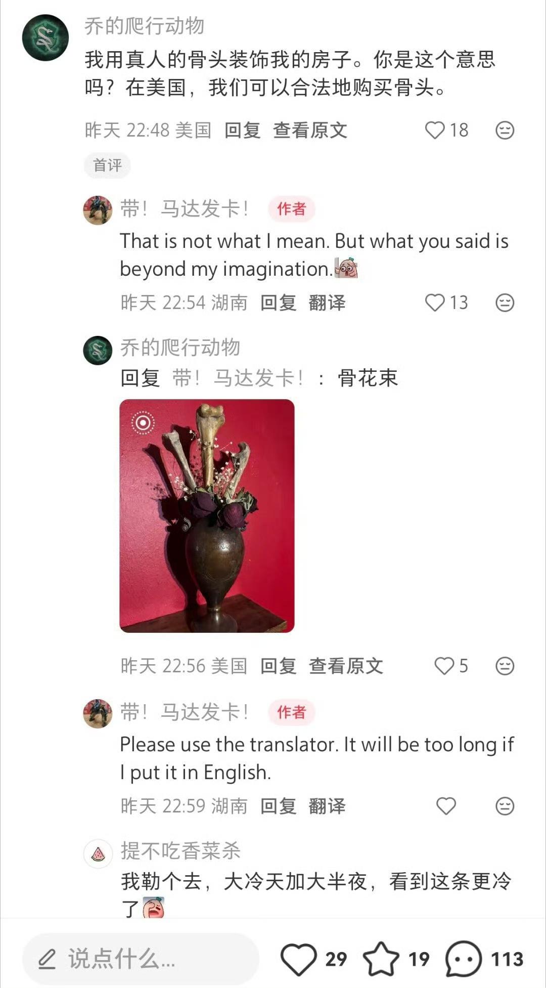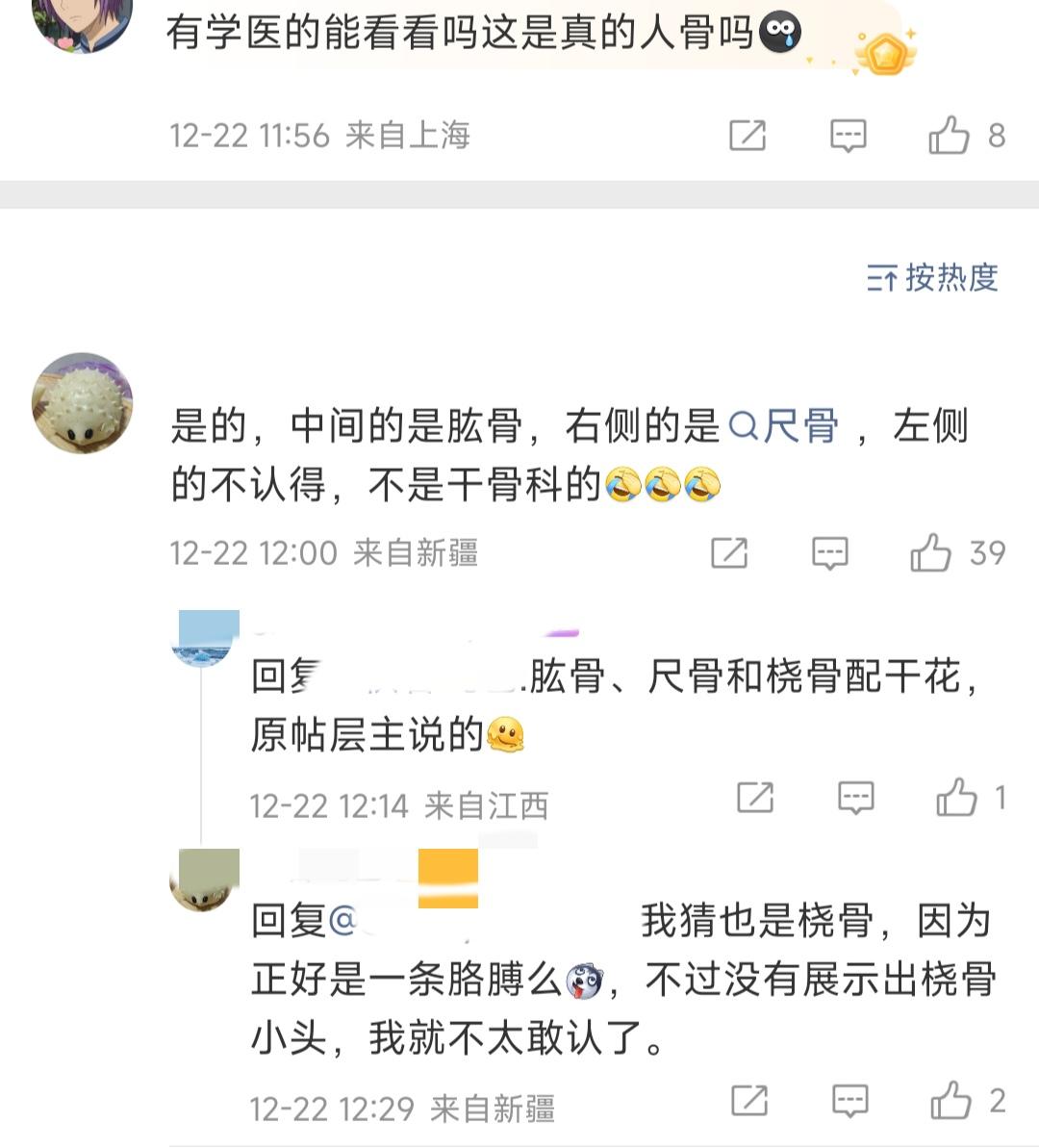 “骨花束”,又一个地狱新词! 你凝视深渊,深渊也在凝视你。 一个中国博主看了牢A故事会后,怀疑不是真的,就跑去xhs上发帖对帐。结果来对账的美国人甩给他一张“骨花束”图片。 网友分析图2图片“骨花束”:中间的是肱骨,右侧的是尺骨,左侧的是桡骨。有请干骨科的人确认。 不要试图了解资本主义克苏鲁,你会被惊悚到和被污染。 在美国,买卖人体骨骼是合法的。 你可曾听过古代欧洲人有段时间流行抽木乃伊粉,用木乃伊入药,炒到木乃伊比黄金都贵。甚至有人为了谋取暴利,开始制作和售卖假木乃伊。 西方的世界,你不懂。