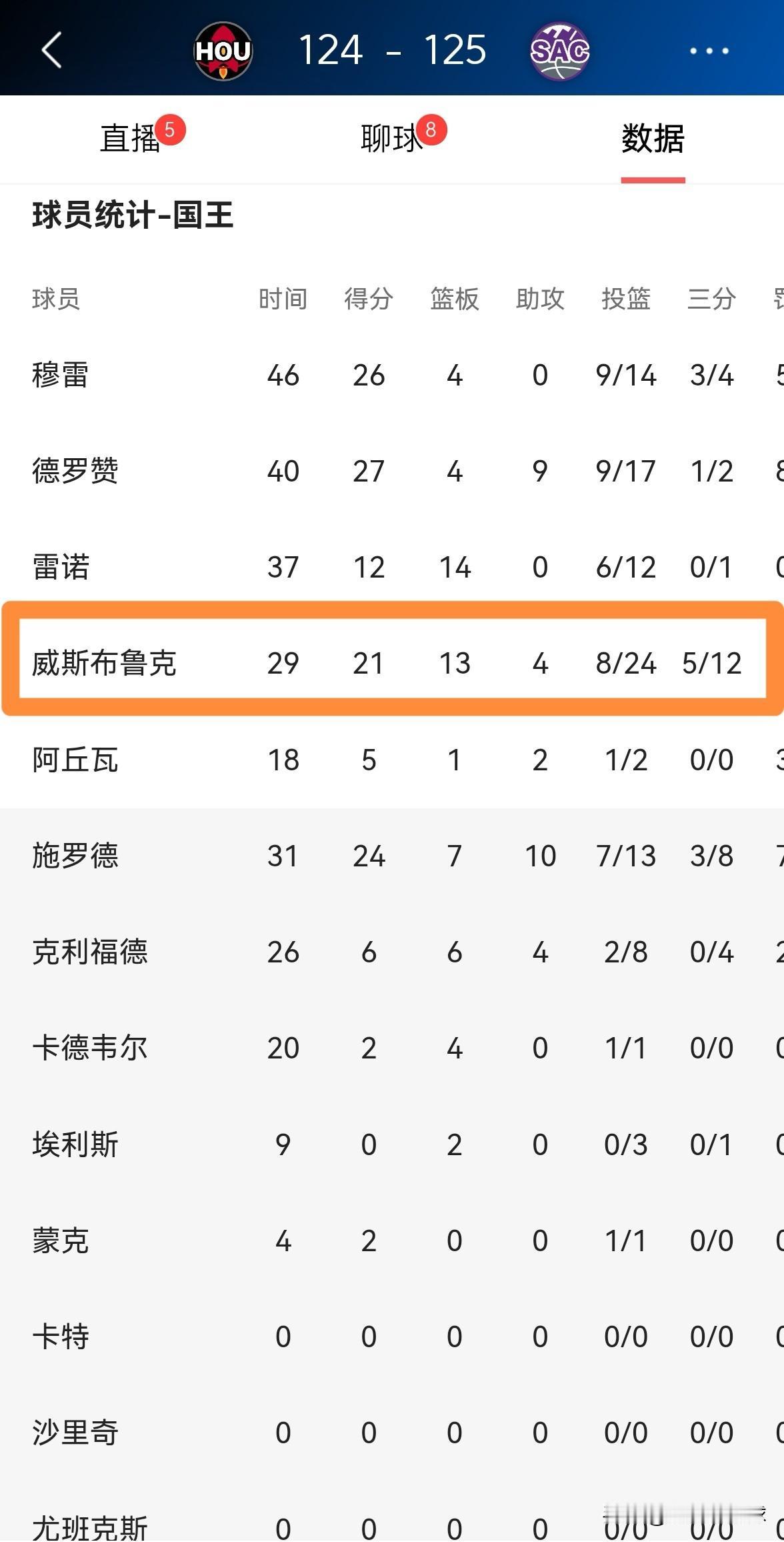 我一定要狂赞国王老将威斯布鲁克!在今天国王主场以125:124险胜火箭的比赛中,威斯布鲁克首发出战29分钟,投篮24中8,其中三分球12中5得到21分13篮板4助攻2抢断,他的场上正负值为+1。 本场比赛,威少从开场以后就展现出了超强的进攻欲望和赢球欲望,作为一名后卫他竟然拼抢到了6个前场篮板,这足以证明他的拼搏精神。尽管威少的投篮命中率依然糟糕,但是他的表现值得所有人的称赞。