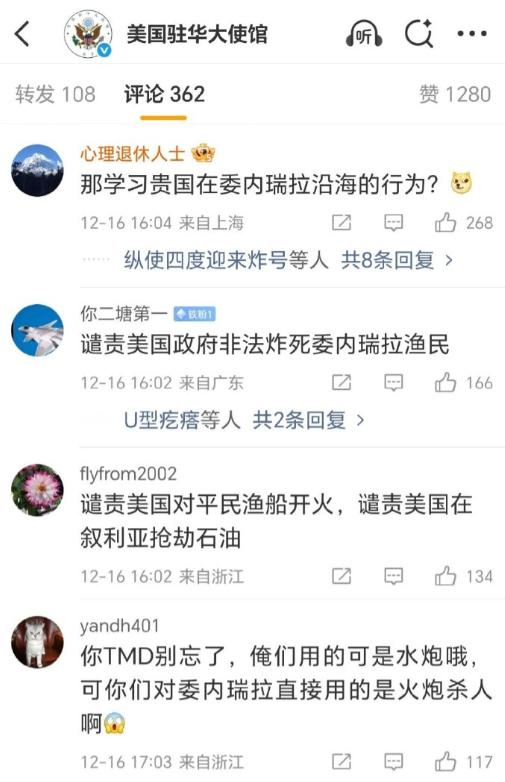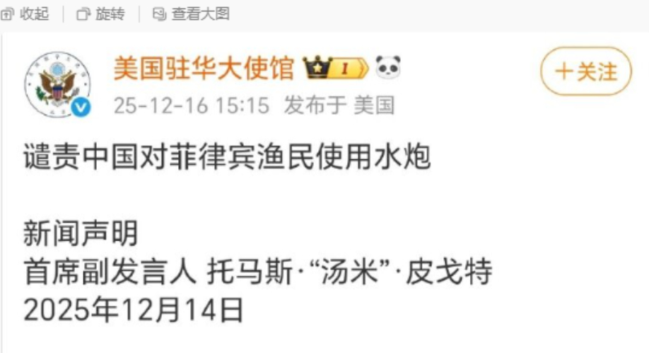美批评中方对菲船动用水炮,却被一句话回怼的说不出话!最近,美国驻华大使馆又发声了,批评中方海警船在仁爱礁附近对菲律宾船只使用水炮,并切断其锚绳。美方措辞严厉,称此举“危及以捕鱼为生的菲律宾人民”,还强调“我们与菲律宾盟友站在一起”。结果,中方网友攻占了其评论区,纷纷反问:那学习贵国在委内瑞拉沿海的行为?还有的网友,干脆直接谴责美国非法炸死委内瑞拉渔民。甚至还提醒美方:别忘了,俺们用的可是水炮哦,可你们对委内瑞拉直接用的是火炮杀人啊。这种“双标式谴责”的后果正在显现。一方面,它削弱了美国在国际舆论场上的道德权威——当自己在别处动辄使用武力时,却对中方非致命执法手段大加挞伐,很难令人信服。另一方面,也促使更多国家反思:所谓“基于规则的国际秩序”,究竟是普遍适用,还是只适用于对手?网友的反问很犀利,一句“你们用火炮,我们用水炮”,看似简单,实则戳中了美方的核心痛点——到底谁才有资格定义“正当”与“暴力”?