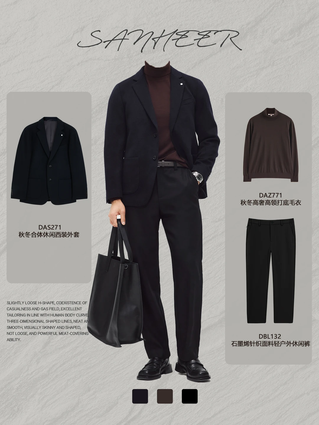 黑西装 + 棕高领 + 黑裤 / 藏青西装 + 白 Polo + 牛仔内搭换休闲款,下班直接转场约会