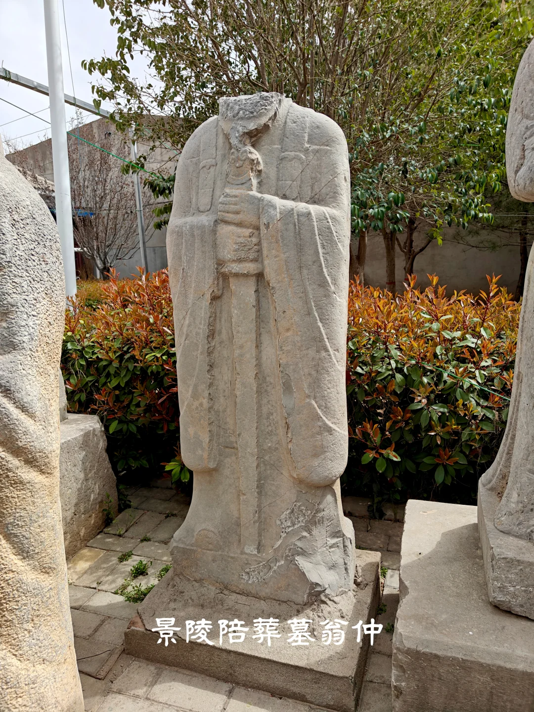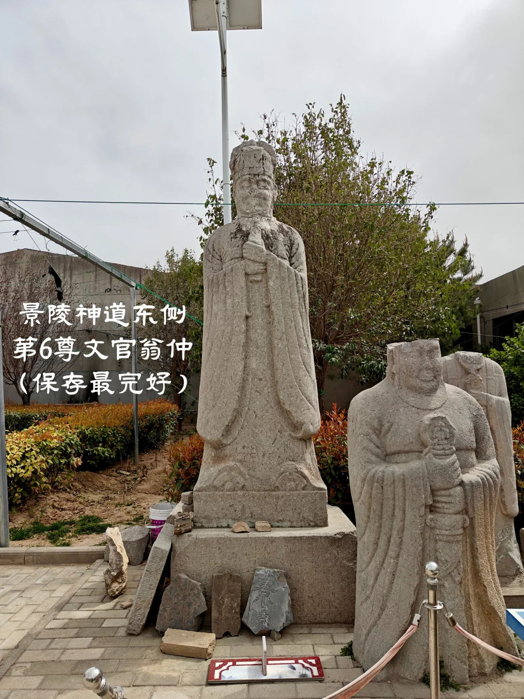 20世纪70年代,刘庆柱在《陜西唐陵调查报告》中记载景陵神道石刻:“石柱东者仆倒、残,西者佚。翼马存二。鸵鸟存西列,东列佚。仗马东列存南起第1、2、3、5,西列南起存第1、2、5。石人仅存东列二尊,其中一残一完好”。 这里提到的完好的一尊石人即为景陵东侧神道第6尊文官翁仲,目前已经迁至景陵文管所保护。