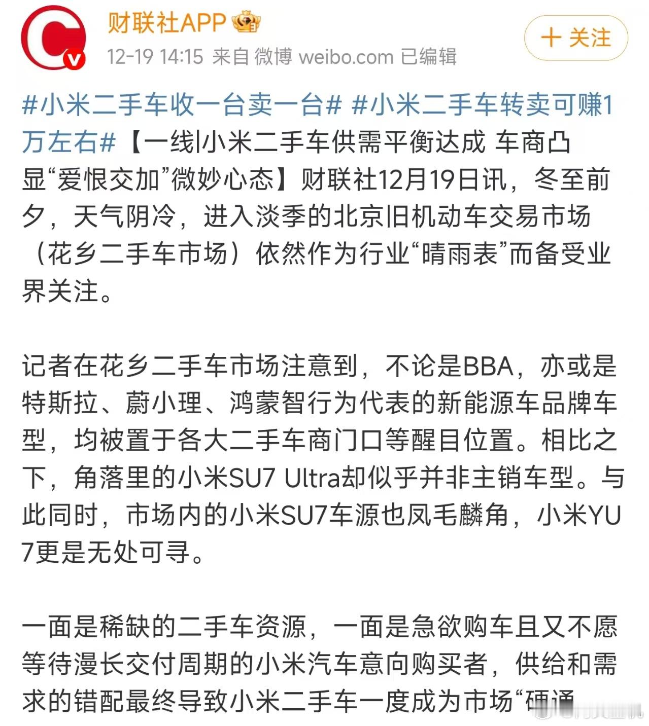小米二手车收一台卖一台小米二手车转卖可赚1万左右,之前看到一堆打着二手车商名义的小号发视频,说小米汽车收了都砸手里了。不好意思,我恰好前段时间才卖了一辆,这保值率,大家都看到了有多强。现在你去看看但凡是有点规模的二手车商,展厅都有小米汽车来充门面。而且像目前SU7和YU7都还是供不应求的阶段,要买车的准车主也很多。这年底了,估计要买车的人又多起来了,估计小米汽车的二手车这段时间会更抢手。