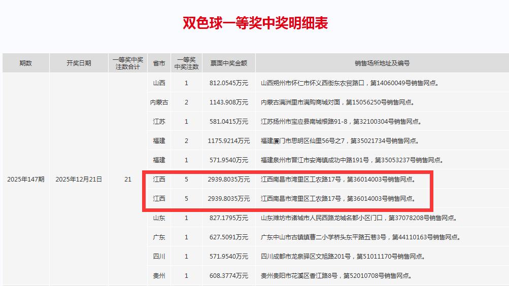 5879万巨奖!福彩官方公告,江西10注双色球头奖都出自南昌市湾里区工农路17号站点,奖票分两张都是5注头奖+二等奖2939万元,两票总计拿下5879万元[赞][赞]这和设想有些出入,一是没想到奖票分两张,其实之前这种先打一票再补票的也不少见;二是投注方式并非单挑,而是蓝球多选一码的复式,看来彩友钻研的不少啊!