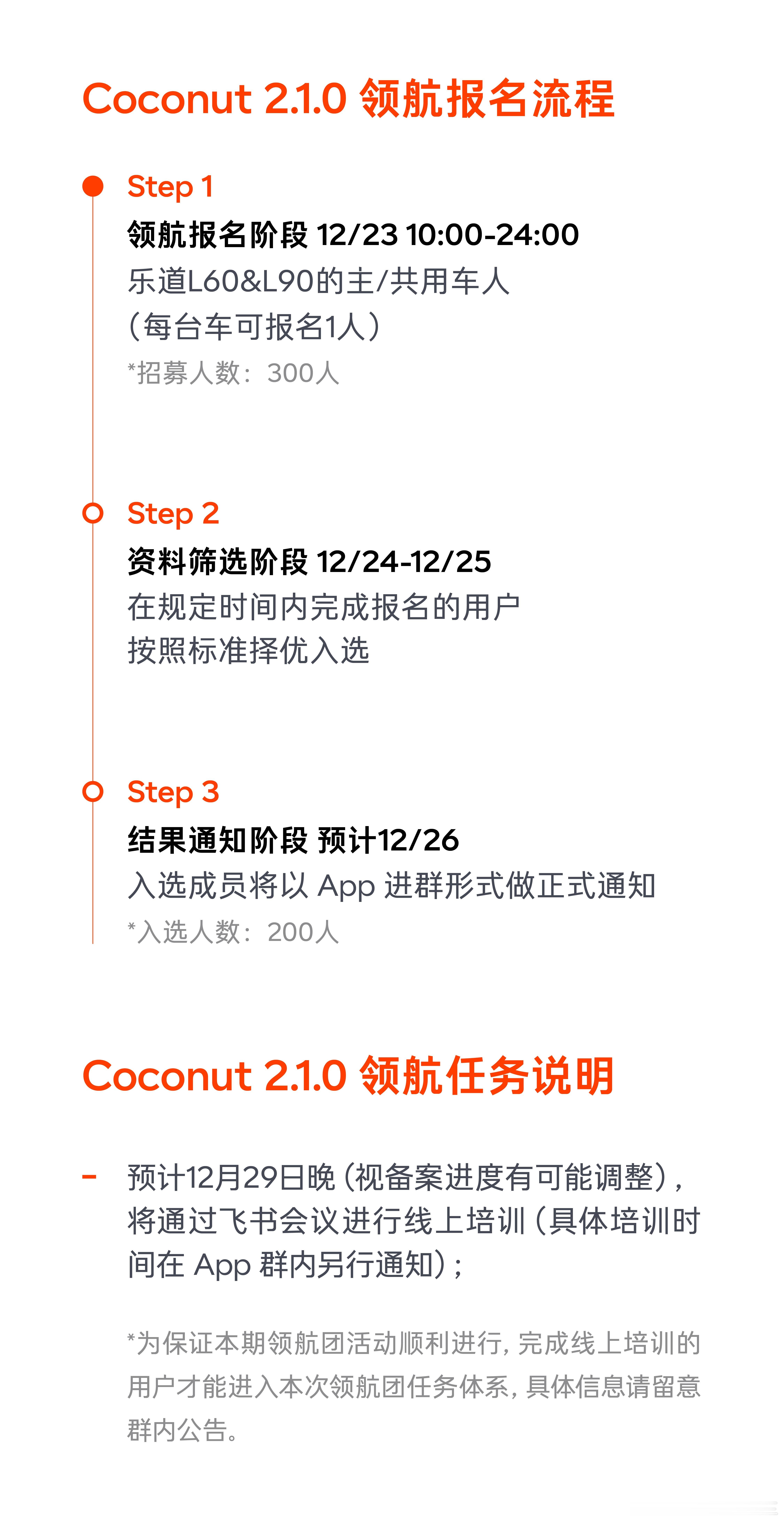 乐道椰子OS 2.1 版本正在招募领航团,按这进度规划全量推送应该是在1月份,将会带来端到端架构的 OSD 城区NOA,期待一下,乐道 OSD 也端上桌的效果。乐道L90乐道L60