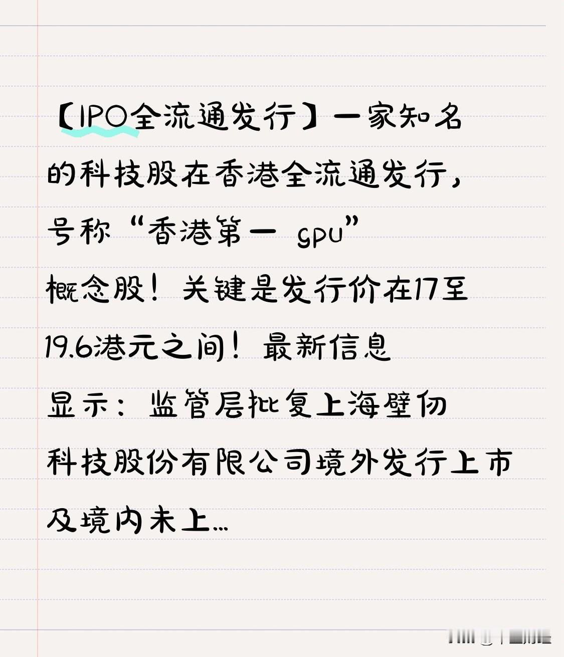 【IPO全流通发行!】一家知名的科技股在香港全流通发行,号称“香港第一 gpu”概念股!关键是发行价在17至19.6港元之间! 最新信息显示:监管层批复上海壁仞科技股份有限公司境外发行上市及境内未上市股份“全流通”备案通知书,公司拟发行不超过372,458,000股境外上市普通股并在香港联合交易所上市。 如果从总股本规模来看,对应的是摩尔在线和沐曦的总股份,在香港是全流通,定价19港元左右,那么,A股中的上述两家gpu概念股,如果全流通的话,恐怕也是这个价!况且,在香港t+0且无涨跌幅限制的交易背景下,此类新股有可能破发! 由此推算,摩尔线程和沐曦股份,存在着极大的泡沫股价,中期走势风险较大!