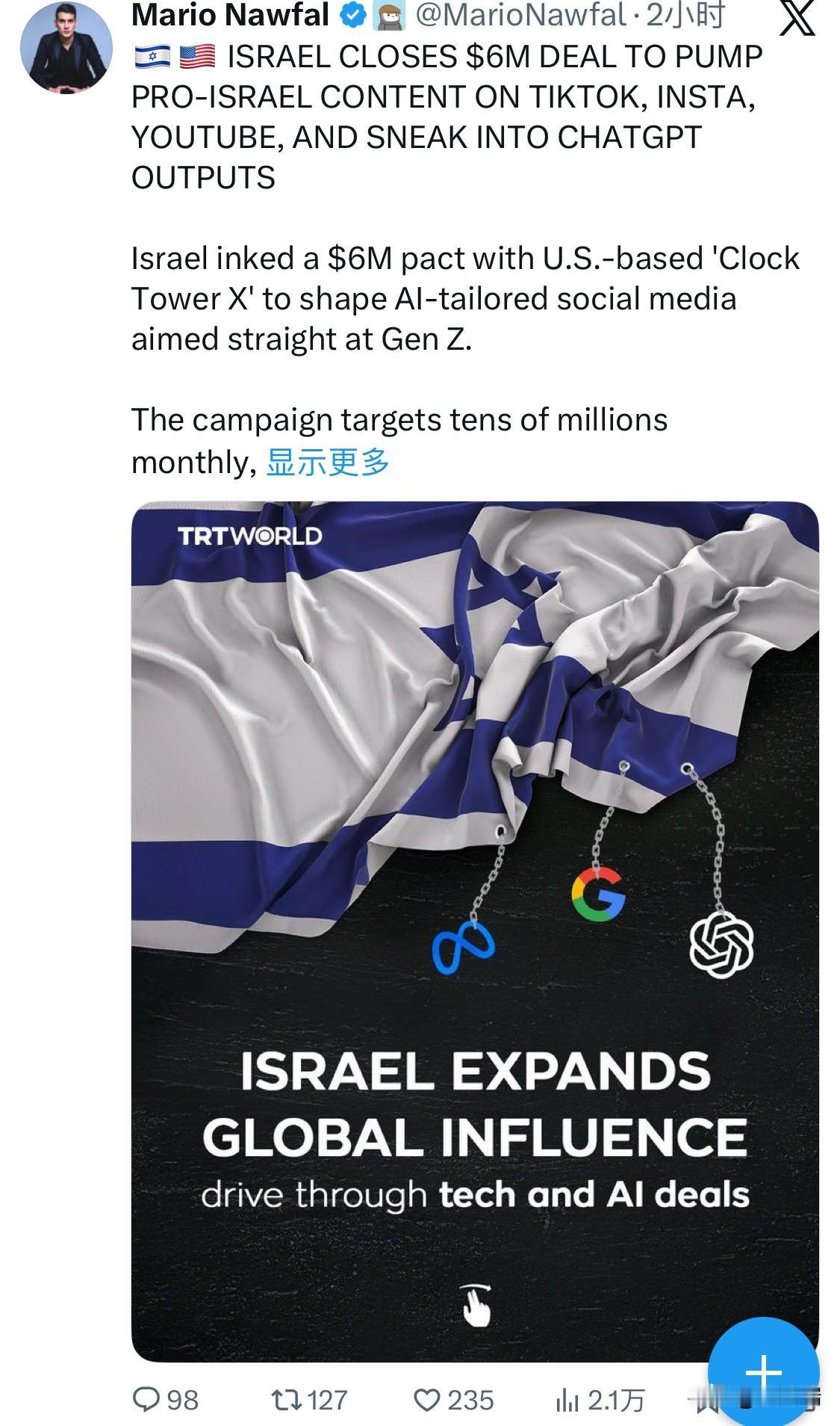 最新消息 :以色列已与美国保守派公司 Clock Tower X LLC 签订了一份价值 600 万美元的合同,该公司由前特朗普竞选经理布拉德·帕斯卡尔 (Brad Parscale) 领导,旨在通过各种平台向 Z 世代传播亲以色列内容。至少 80% 的内容将投放于 TikTok、Instagram、YouTube 和播客等平台,目标是每月获得 5000 万次曝光。该公司还将构建新的网站,以影响 ChatGPT 等人工智能模型对以色列的描述,并部署 MarketBrew AI 来提升亲以色列内容在谷歌和必应等搜索引擎上的排名。