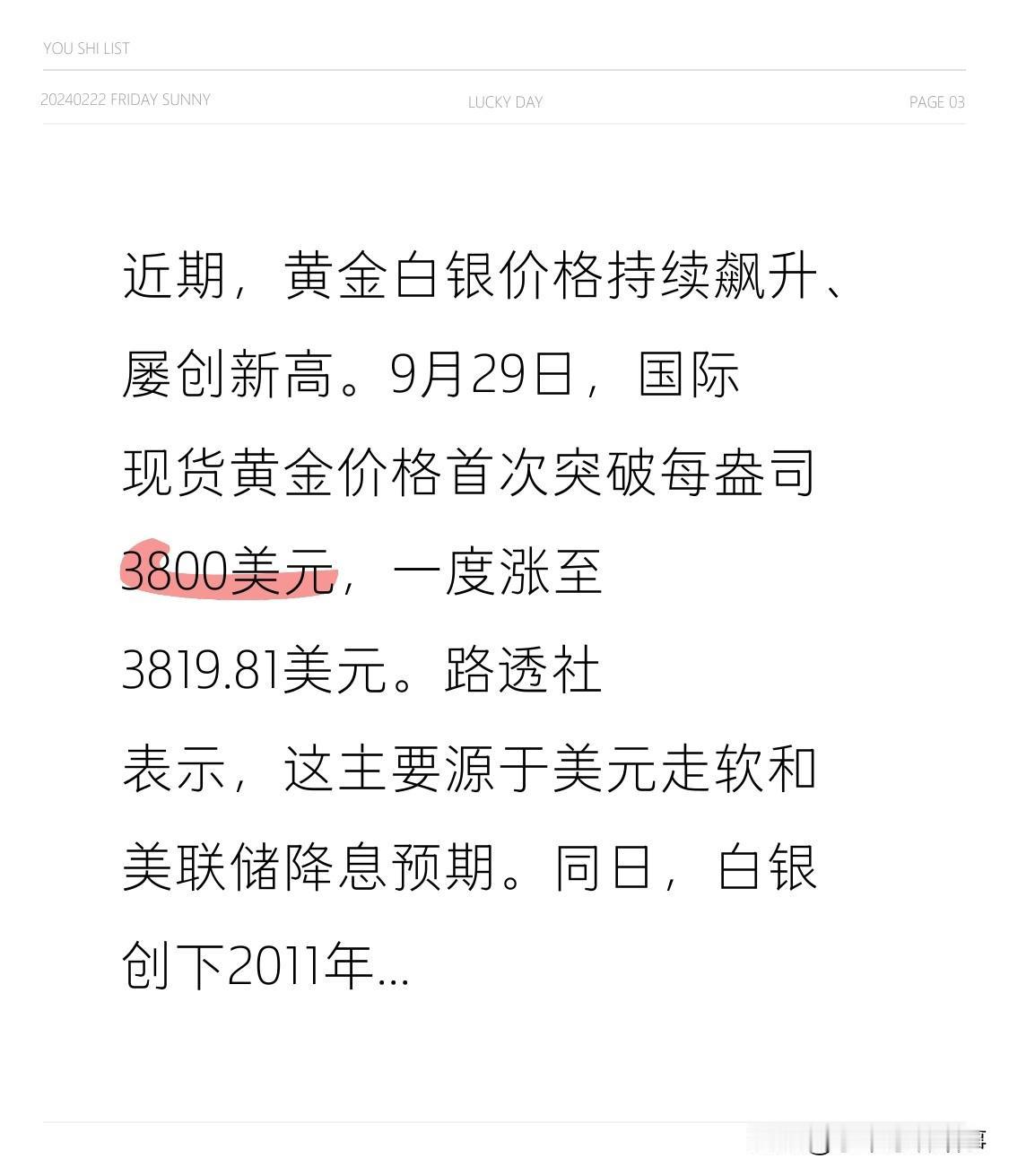 近期,黄金白银价格持续飙升、屡创新高。9月29日,国际现货黄金价格首次突破每盎司3800美元,一度涨至3819.81美元。路透社表示,这主要源于美元走软和美联储降息预期。同日,白银创下2011年以来新高。 国庆假期,金银涨势未歇。10月2日,现货白银一度突破48美元/盎司,现货黄金飙升至3896美元/盎司,当晚却高位跳水。去年现货黄金涨27%,今年累计涨幅48%,有望创1979年以来最大年度涨幅。国内金饰疯涨,周大福等足金首饰达1129元/克,行情令人又喜又惊!