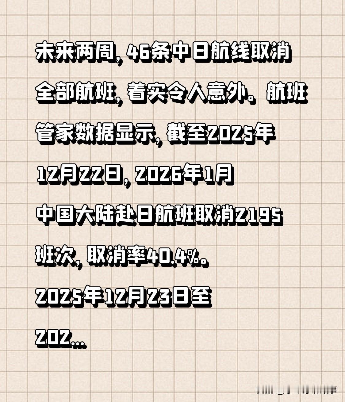 未来两周,46条中日航线取消全部航班,着实令人意外。航班管家数据显示,截至2025年12月22日,2026年1月中国大陆赴日航班取消2195班次,取消率40.4%。 2025年12月23日至2026年1月5日,这46条航线“零航班”,涉及中日38座机场。近期往返中日的旅客行程全乱了,不知大规模取消原因,望后续妥善解决,恢复正常出行。