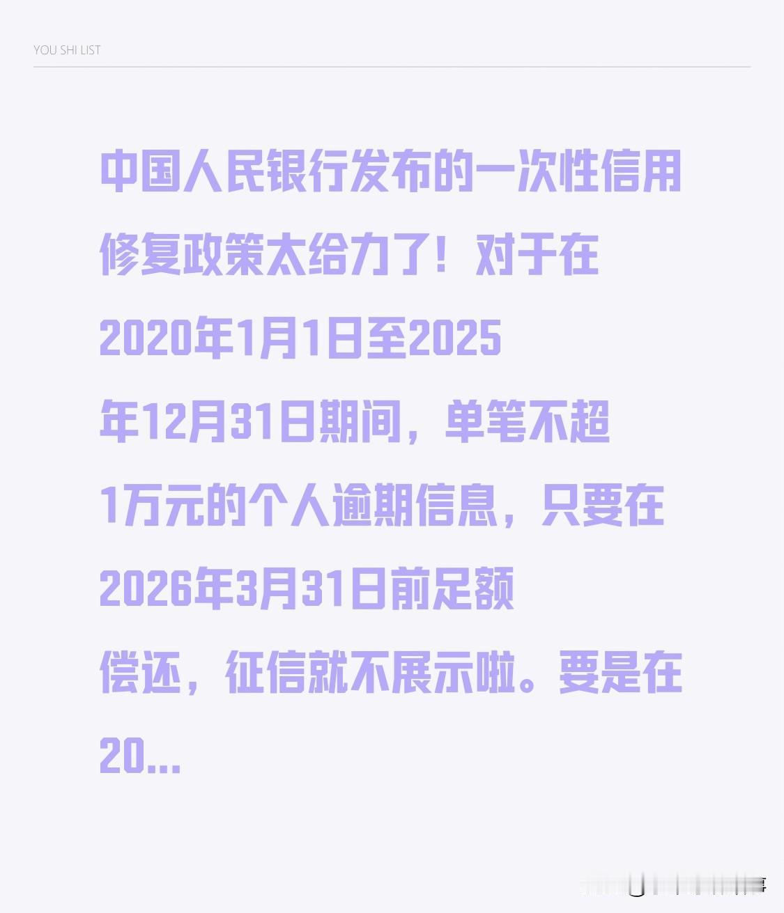 中国人民银行发布的一次性信用修复政策超给力!2020年1月1日至2025年12月31日,单笔不超1万元的个人逾期信息,2026年3月31日前足额偿还,征信便不展示。 2025年11月30日前还,2026年1月1日起不展示;2025年12月1日至2026年3月31日还,次月月底前不展示,且“免申即享”。2026年上半年多2次线下免费查征信机会,对积极还款者是及时雨!