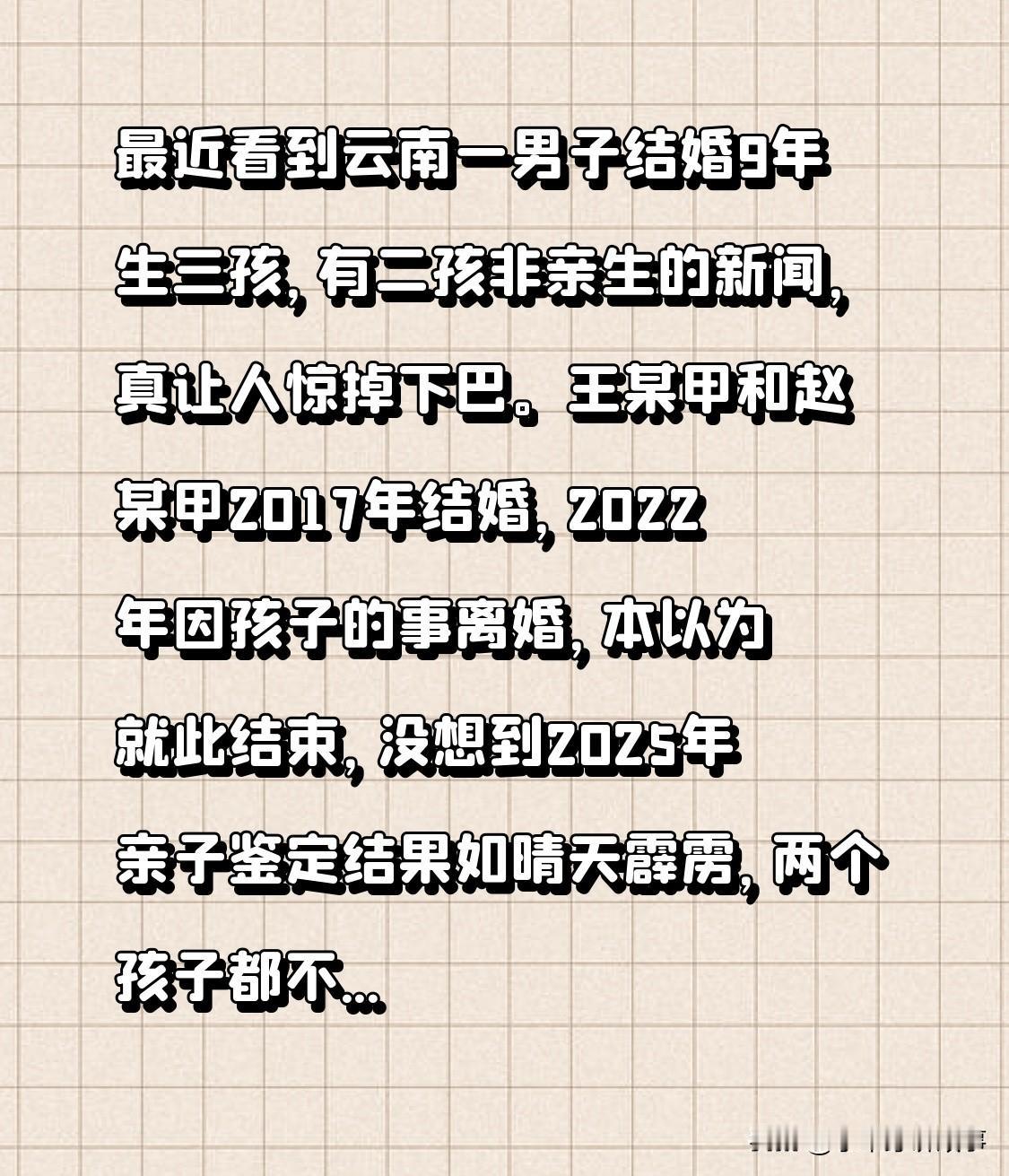 惊爆!近日,云南一男子结婚9年育有三孩,其中二孩非亲生的新闻令人大跌眼镜。王某甲与赵某甲2017年成婚,2022年因孩子事宜离婚,本以为尘埃落定,不料2025年亲子鉴定结果如雷轰顶,俩孩子都非他亲生。 此前江西、淄博也有类似事件。这是现代人太开放,还是有人公然破坏婚姻?网上那些以曹操为爱好或偶像的网名,难道真如调侃,羡慕曹操能轻易得人妻?这些事引人深思婚姻。