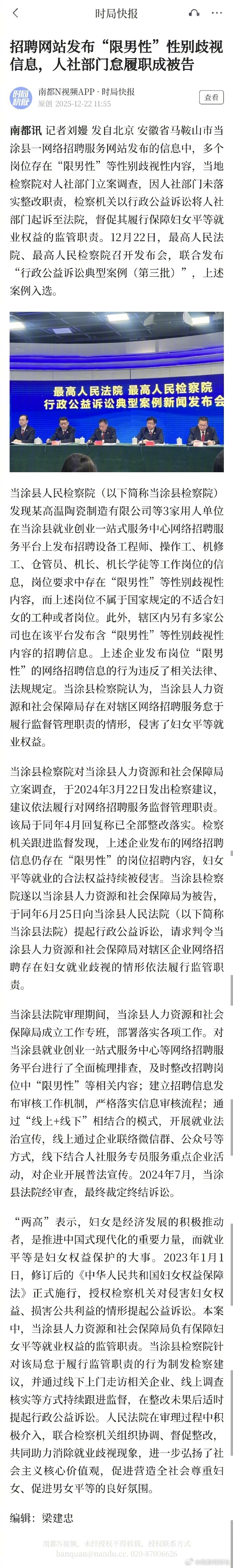 #招聘网站岗位限男性人社局成被告#【招聘网站发布“限男性”性别歧视信息,人社部门怠履职成被告】#企业招聘限男性人社局成被告# #企业招聘岗位限男性人社局成被告#安徽省马鞍山市当涂县一网络招聘服务网站发布的信息中,多个岗位存在“限男性”等性别歧视性内容,当地检察院对人社部门立案调查,因人社部门未落实整改职责,检察机关以行政公益诉讼将人社部门起诉至法院,督促其履行保障妇女平等就业权益的监管职责。12月22日,最高人民法院、最高人民检察院召开发布会,联合发布“行政公益诉讼典型案例(第三批)”,上述案例入选。