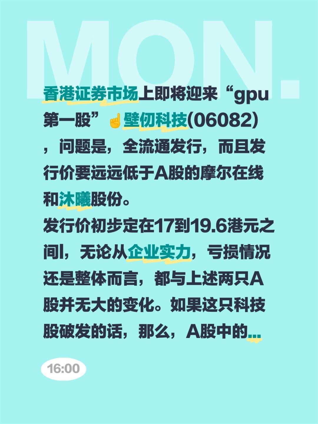 港股与A股同类对比,摩尔沐曦泡沫大!香港证券市场上即将迎来“gpu第一股”☝壁仞科技(06082) ,问题是,全流通发行,而且发行价要远远低于A股的摩尔在线和沐曦股份。 发行价初步定在17到19.6港元之间l,无论从企业实力,亏损情况还是整体而言,都与上述两只A股并无大的变化。如果这只科技股破发的话,那么,A股中的摩尔线程,沐曦股份的泡沫化崩跌有可能非常的深! ipo上市 科技股
