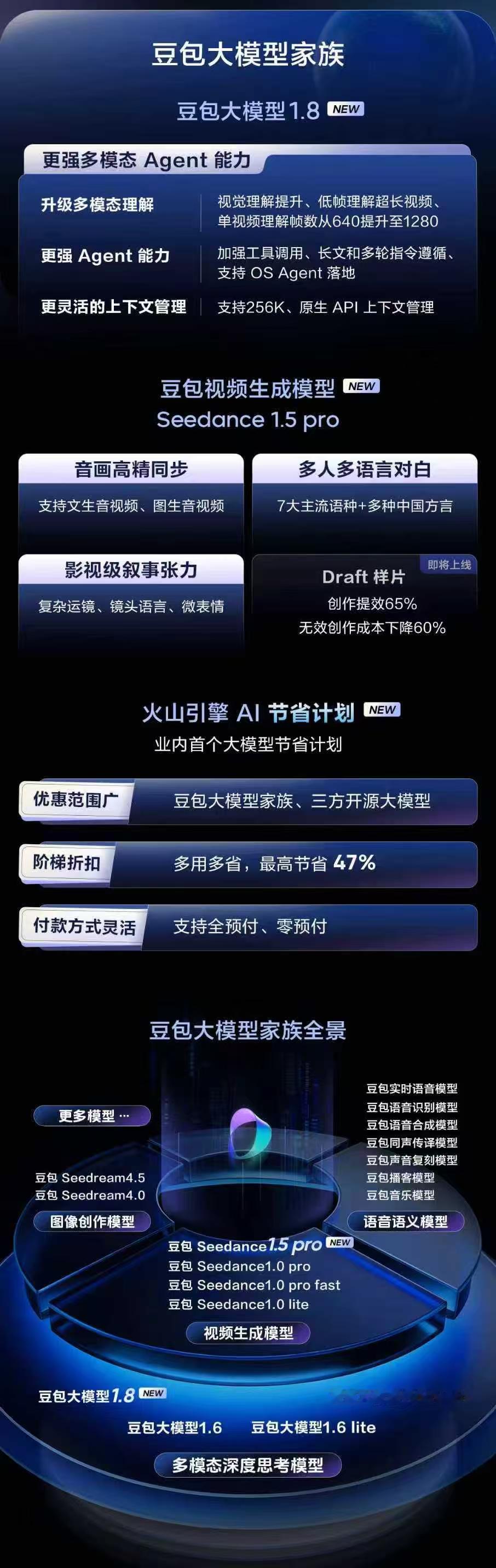 日均50万亿Tokens,中国第一、全球第三!这一天终于来了! 就在昨天的FORCE 原动力大会上,一连串“王炸”爆料,把字节跳动的AI家底和野心全抖露了出来了!可谓信息量极大、料满满。废话不多说,直接划重点: 第一,截止今年12月,豆包大模型日均Tokens处理量已突破50万亿。这是什么概念呢?据官方权威发布认证:这个规模稳居中国第一、全球第三! 这不是实验室虚拟的数据,而是脚踏实地,实打实的硬核产业用量数据。这背后是超过100家企业的万亿级使用。同时,IDC等第三方报告也已证实了,其市场份额稳居头部! 第二,在这次大会上,火山引擎总裁谭待高调的表示:“我们正迈向以 Agent 为技术主体的时代,传统 IaaS、PaaS、SaaS 分层规划的IT架构不再有效,以模型为中心的AI云原生架构正在形成。”这意味着传统IT架构已过时了,未来是 “AI云原生” 的天下。模型就是新软件的核心,算力按Tokens消费,一切围绕智能体(Agent)来重构。这直接定义了火山引擎乃至字节跳动的全新战局。 第三,大会上,火山引擎产品矩阵齐发布,覆盖AI全链路。 模型层:推出更强的豆包大模型1.8(专为多模态Agent优化)和视频生成模型Seedance 1.5 pro(音画同步,影视级)。 平台层:升级MaaS服务,搞了业内首个 “AI节省计划” ,号称最高省47%成本,这是要打价格战横扫市场? Agent层:重磅推出企业级Agent开发平台AgentKit(代码量减少96%)和“1+N+X”智能体工作站HiAgent,目标直指让AI智能体像员工一样在企业里规模化上岗。 简单明了的说,这就是用豆包大模型作为底层核动力,通过创新的MaaS和节省计划吸引并锁住企业客户,最后用AgentKit和HiAgent这两大平台,把客户牢牢地捆绑在了自己的AI生态里,整套下来,完美的完成从“卖算力”到“卖智能生产力”的进化。 太劲爆了,这已不是单一产品的发布了,而是一套完整的AI时代操作系统级布局。字节AI、火山引擎整体战略,全面亮剑了,期待!