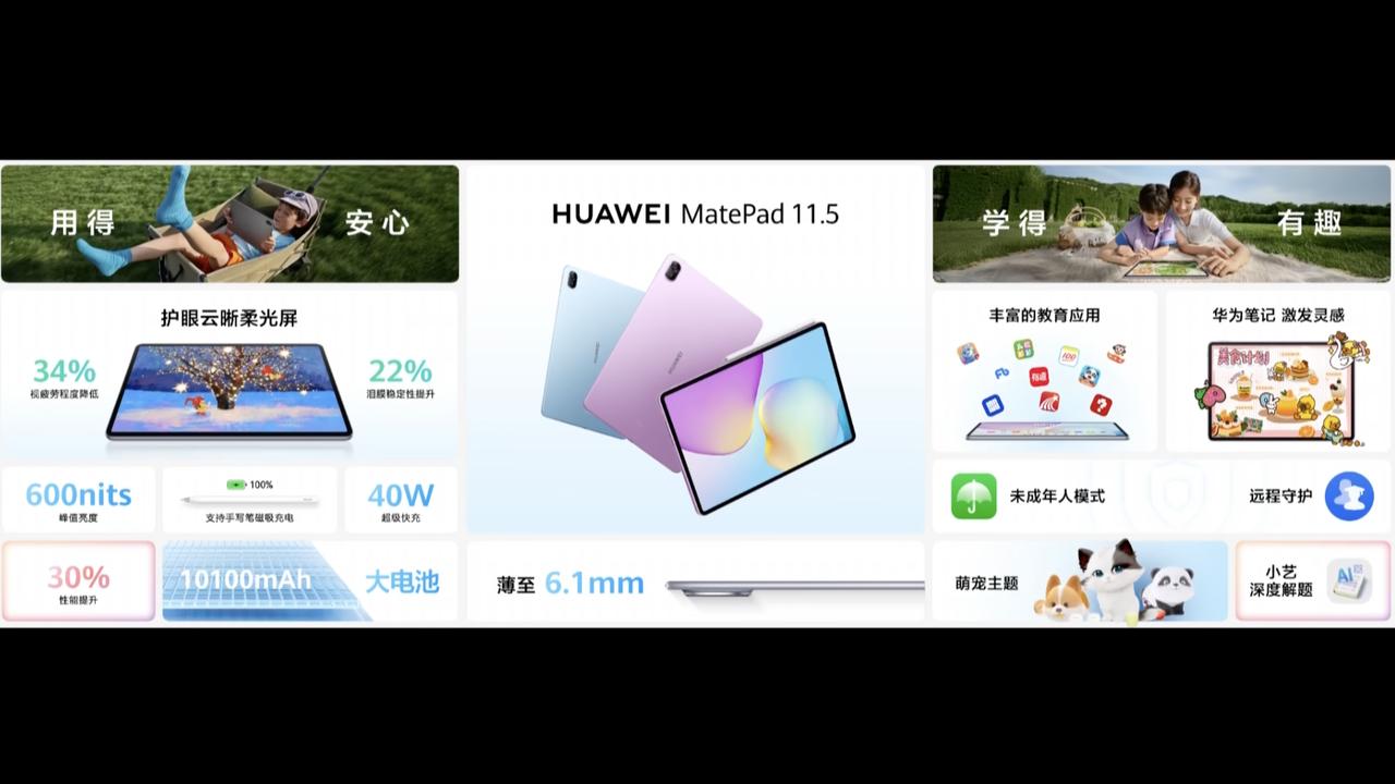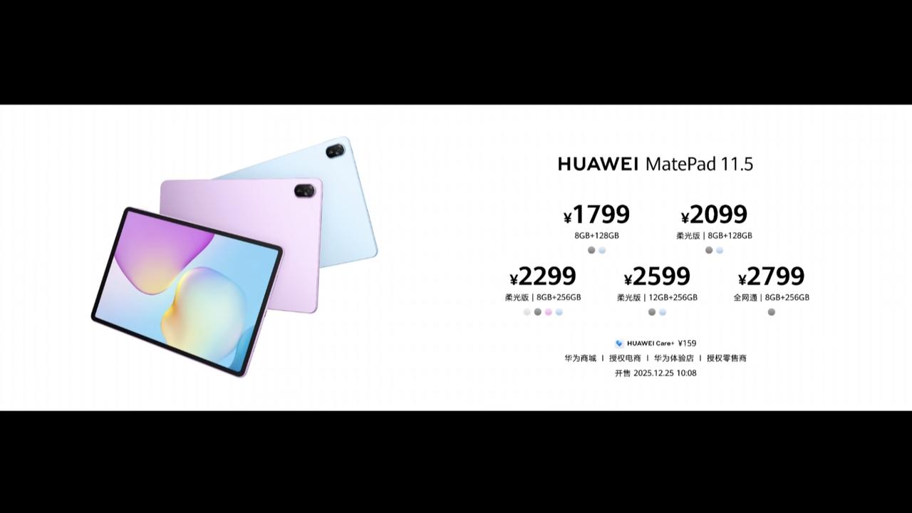 华为 MatePad 11.5 发布,8+128GB 售价 1799 元、8+128GB 柔光版售价 2099 元、8+256GB 柔光版售价 2299 元、12+256GB 柔光版售价 2599 元、8+256GB 全网通版售价 2799 元。 - 芯片:标准版搭载麒麟 T82B 处理器,柔光版搭载麒麟 T82 处理器; - 屏幕:11.5 英寸 2456×1600 LCD 屏幕,120Hz 刷新率,全屏最高亮度 600nit,DC 调光,支持类自然光显示; - 相机:前置 8MP,后置 13MP 单摄; - 续航:10100mAh 电池,40W 快充; - 其他:厚 6.1mm,重 515g,羽砂紫、海岛蓝、冰霜银、深空灰 4 款配色,支持 Wi-Fi 6,蓝牙 5.2,USB 2.0,双麦克风四扬声器,HarmonyOS 5.1 系统。