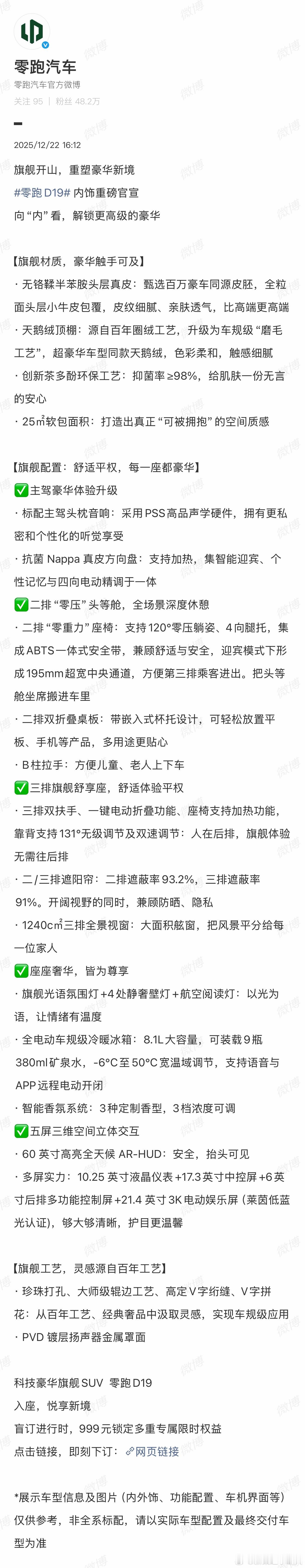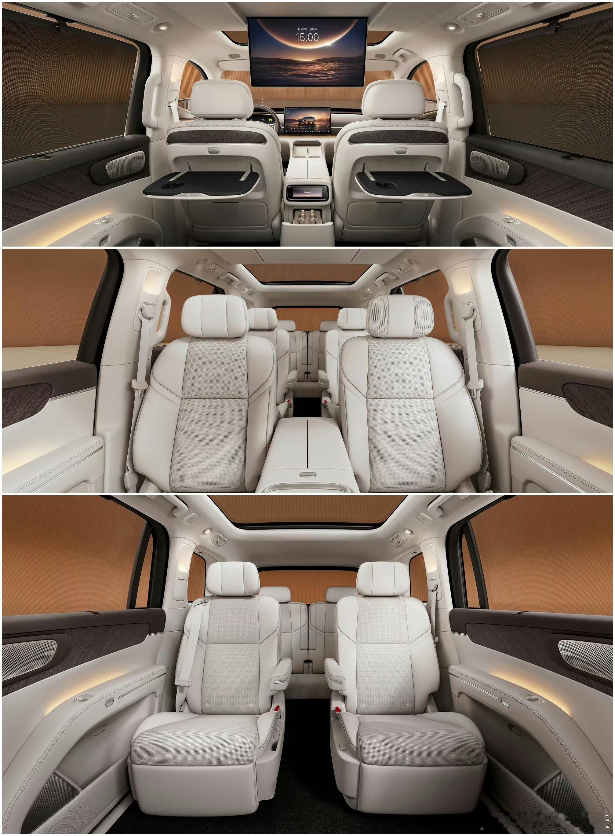 零跑 D19 的内饰提前偷跑,官方干脆“自曝”了目前大六座车型主要有“老钱风”和“居家风”两种设计流派,D19 明显属于后者。整体设计风格比较和谐,不会让人觉得“用力过猛”,但在用料上却毫不含糊。其他方面,配置堆得很足(图3),价格预计也会相对亲民,应该会成为明年大三排 SUV 市场的有力搅局者。零跑D19零跑汽车