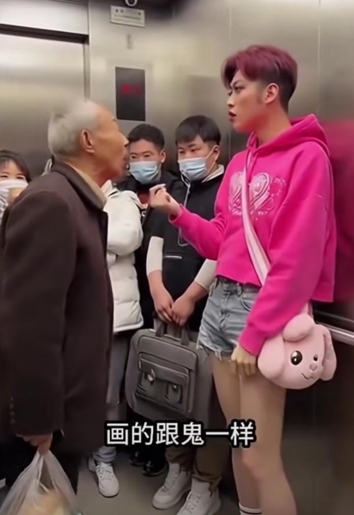 电梯里一位大爷怒斥一个小伙子的妖艳的穿戴打扮,小伙子也不甘示弱回怼。 有人说,现代社会,穿戴自由,老大爷多管闲事。 也有人说,穿戴虽自由但男人总还得有点男人味。 还有人说,干脆把这些不伦不类的人统统送到战场去![捂脸]