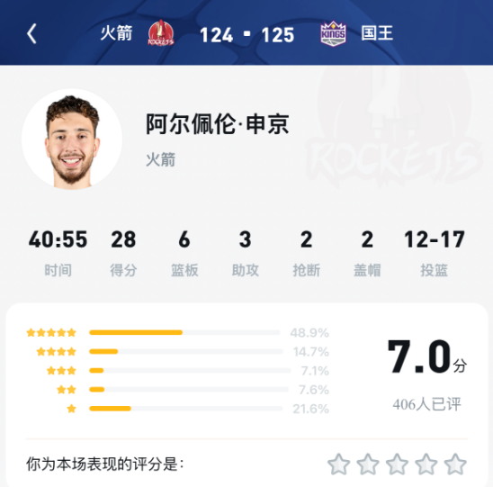 火箭新星伊森真是虽败犹荣!虽然今天火箭在客场以124:125遗憾的输给了国王,但
